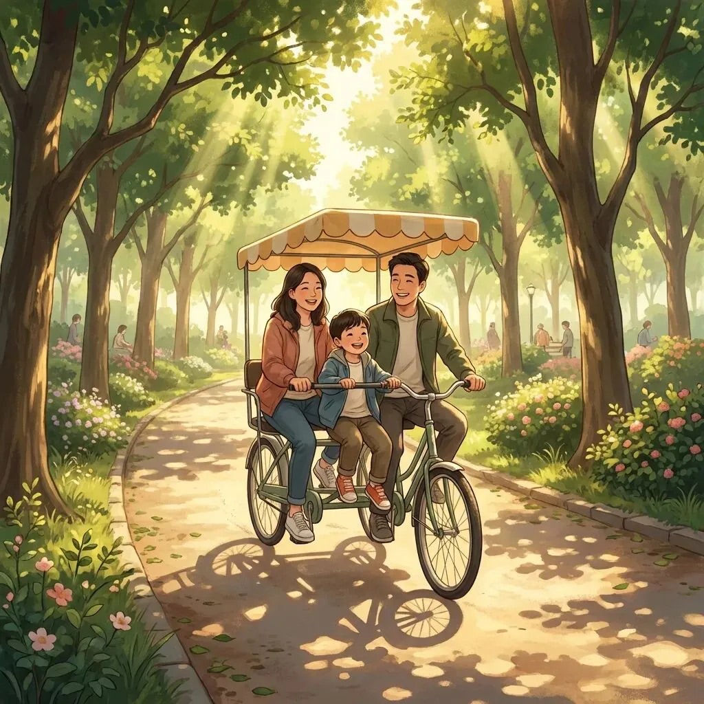 你可以自带自行车,也可以在门口租赁多人自行车(双人或四人座),非常适合一家三口或情侣互动。骑行在林荫大道上,风吹过耳边的声音,就是自由的声音。