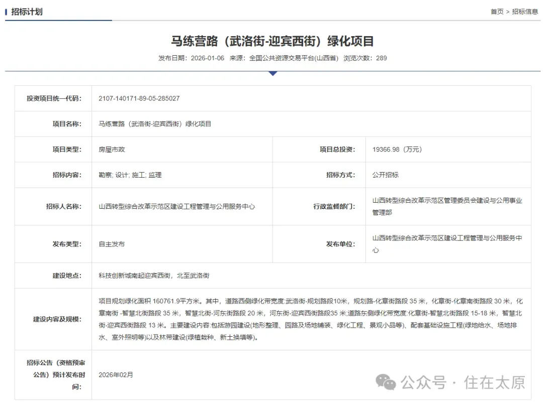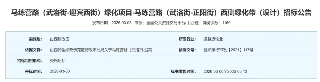 公告显示:本招标项目马练营路(武洛街-迎宾西街)绿化项目-马练营路(武洛街-正阳街)西侧绿化带设计招标项目已由山西转型综改示范区行政审批局批准建设,招标人为山西转型综合改革示范区建设工程管理与公用服务中心,项目资金来源为示范区财政投资。本项目己具备招标条件,现对该项目设计进行公开招标。