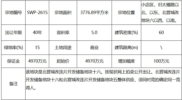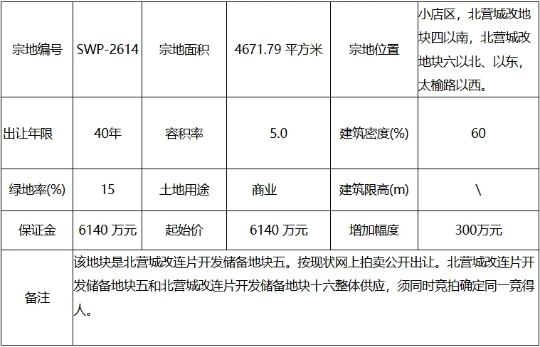 位于小店区,北营城改地块四以南,北营城改地块六以北、以东,太榆路以西。起始价6140万元。