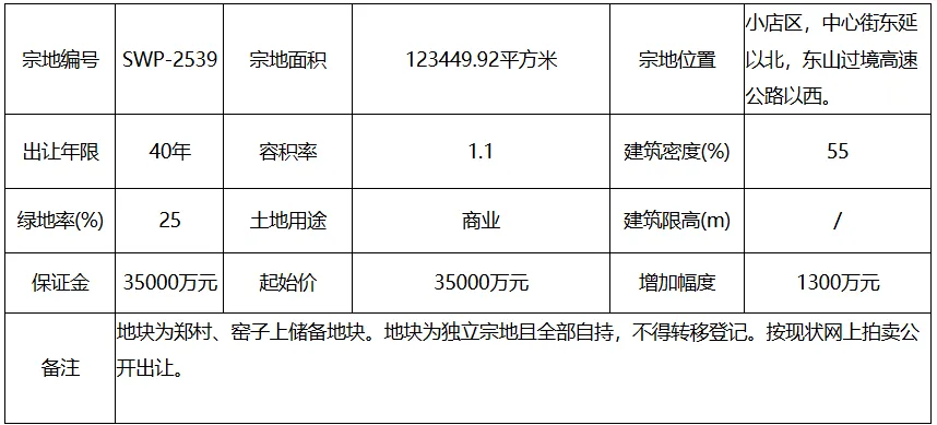 地块为郑村、窑子上储备地块。地块为独立宗地且全部自持,不得转移登记。宗地位于小店区,中心街东延以北,东山过境高速公路以西。拍卖报价时间为:SWP-2539号地块:2026年3月27日9时00分。