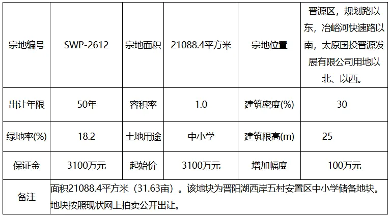 该地块为晋阳湖西岸五村回迁安置区中小学储备地块,起始价3100万元。