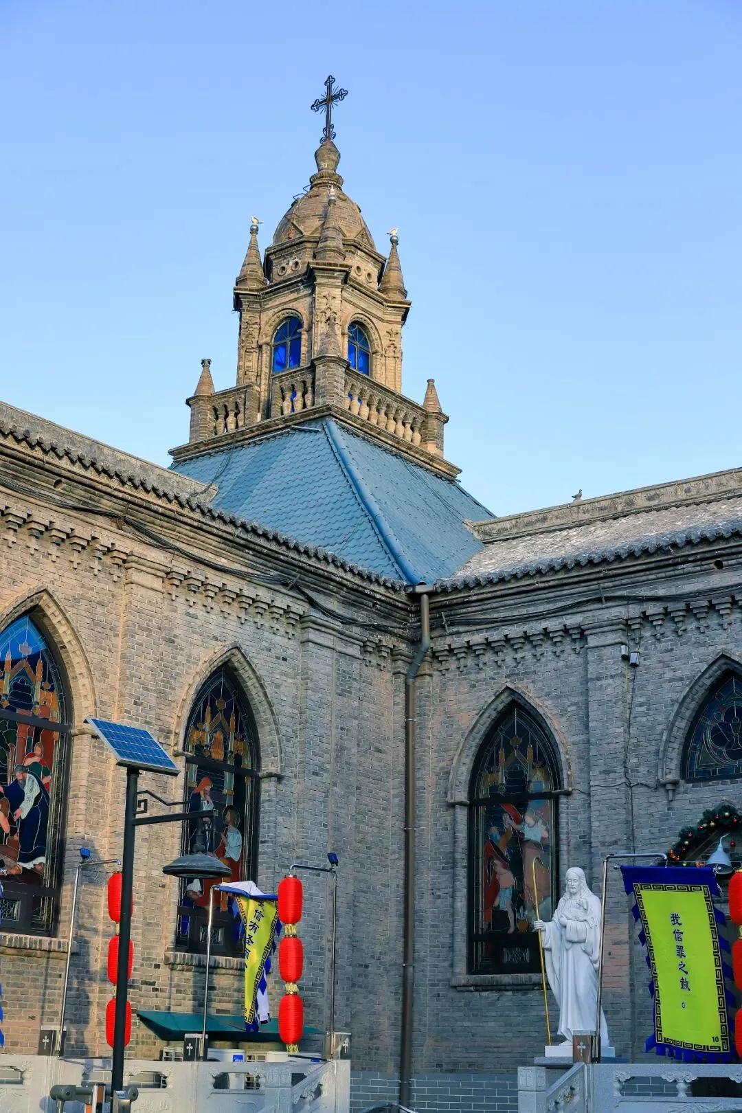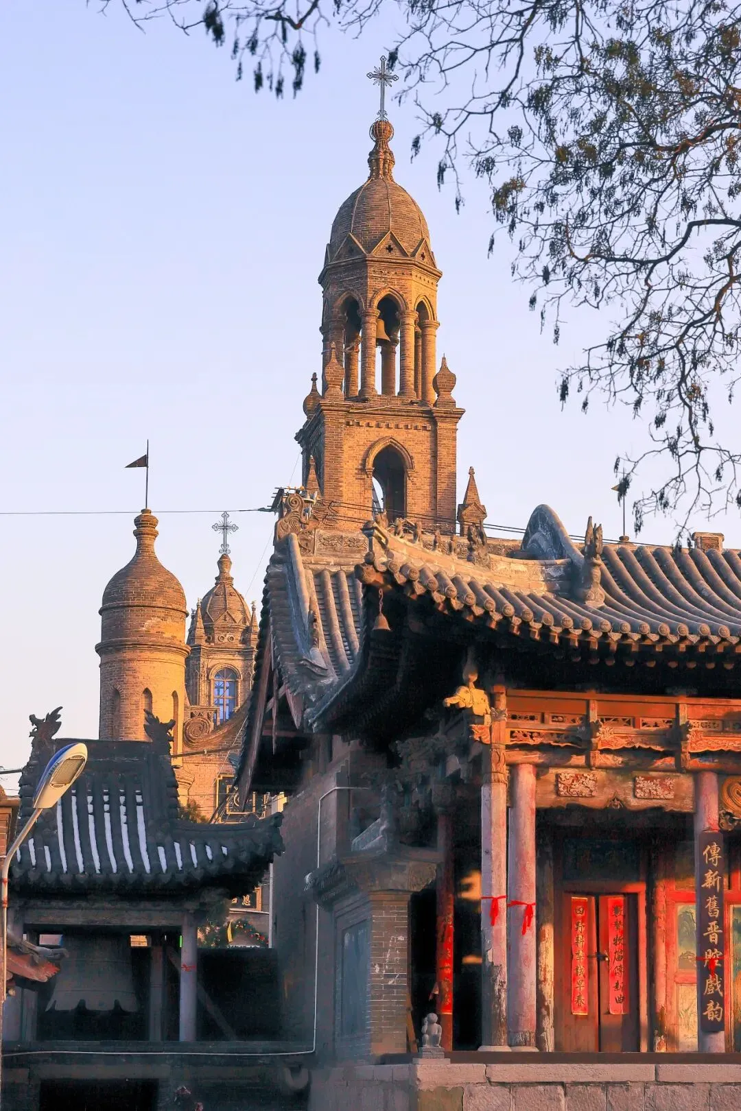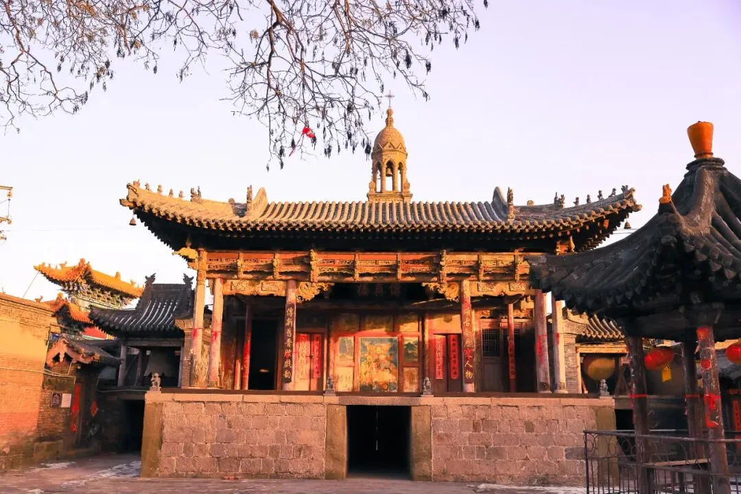 古城营天主教堂:九龙庙的对面,最早建于清光绪年间,现存教堂为1989年重建,依然保持着哥特式风格,它坐东面西临大街,中间钟楼高,两旁尖楼略低,是古城营村的地标性建筑。东方“圣母”与西方“圣母”隔街相望,和谐共处,堪称一绝,从九龙庙院里就可以拍到天主堂尖顶和戏楼屋檐的合影,堪称古城营村"中西合璧"的经典画面。