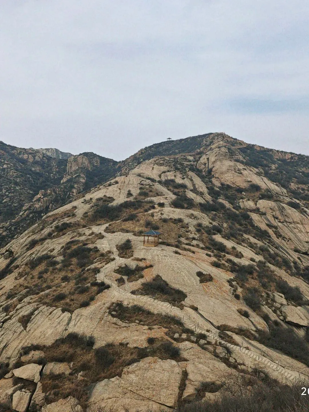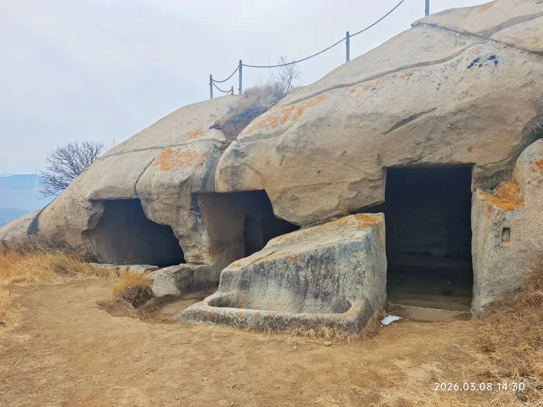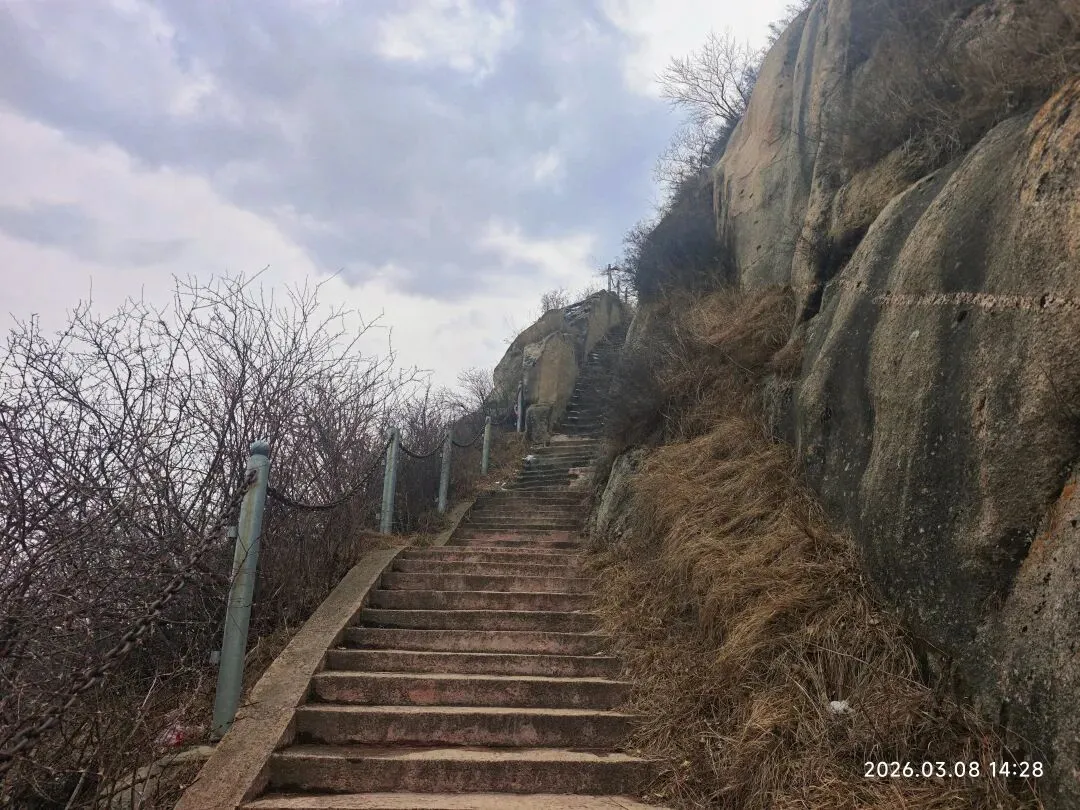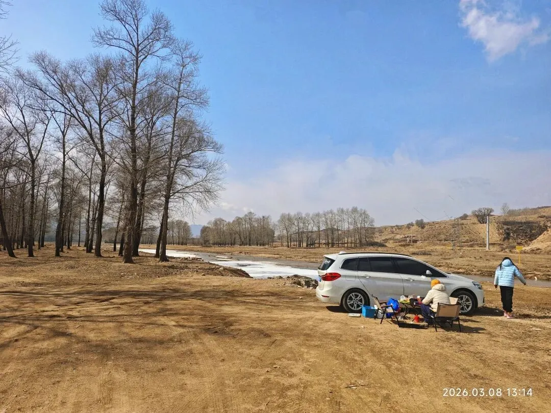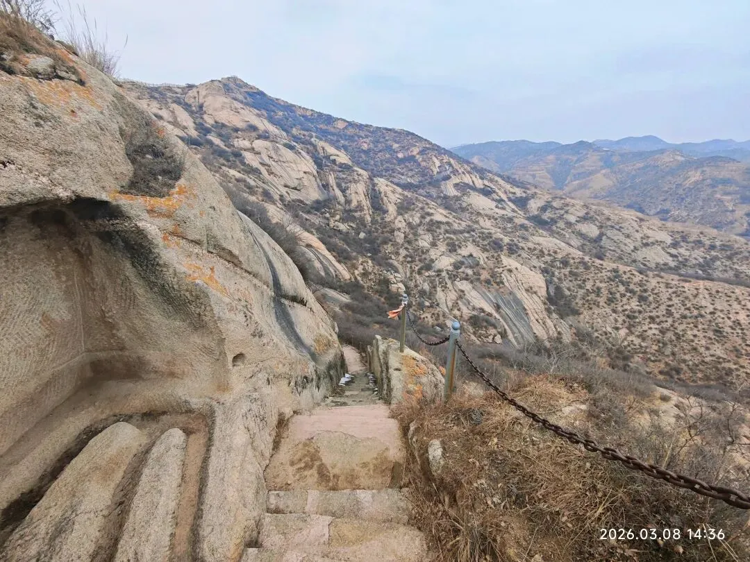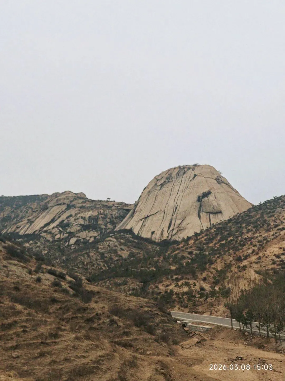 要说礼物,全日的陪伴和一日的露营生活,带她们看山看水看风景,就当礼物了。自从去年带孩子去了一趟河北西柏坡了解熟悉了三大战役之后,谁知孩子对中国近代史愈发感兴趣,打破砂锅问到底,把中国从辛亥革命到北伐,到共产党的革命历程,再到抗日战争,解放战争,朝鲜战争这一大段历史都梳理学习了一遍,所以对这些红色纪念馆特别感兴趣。可谁知到了纪念馆门口,人家不开门,也没电话,敲门没人应。稍有遗憾,所以无奈就去了康家会镇背后的东碾河溿寻了一块开阔地,生火做饭,吃完饭去爬山。河道开阔,两边树林较多,而且来的人少,比较干净,一幅安静恬然的画面。但是到了静乐县境内,空气清澈许多,阳光明媚耀眼,白云朵朵可见,天空的底色蓝的清爽。北方的春天还是很矜持的,一望无垠的草木黯然,没有一丝春色点亮。唯独阳光与风的味道,夹着些春的气息,不似冬天那般凌厉了。河水畅快淋漓,少量浮冰还保留着冬日的姿态,不甘屈从,仍旧倔强。但是欢快的水流,已经在迎接一场盛大春光即将浩浩荡荡地席卷而来。合着这一棵棵树木,一缕缕水流,一座座山坡,畅享一顿只属于我们三人的户外午餐。悬钟山,因其形如倒扣古钟,而得名,山体就是一块巨大花岗岩石头,它不是主峰,却是山中最大的显眼包。不过人工雕琢修筑的登山石阶,让登山难度简易不少,一路只需拾级而上,即可到达这个钟顶之上。如果想继续前行,沿着台阶顺着山脊台阶一路前行即可。上钟顶的有一小段台阶还是有些陡峭的,但是难度不大。钟顶之上还有开凿的三个石洞,方方正正,一间大约一个小卧室般大小。三个石洞旁边还真有一个搭建的石窑洞锁着门,门缝中看了一下,确实挂着一个牌牌写着“悬钟道人”,真有隐士曾在这里隐居了,不知道现在还在吗?爬上来,全身热气腾腾,汗流浃背。