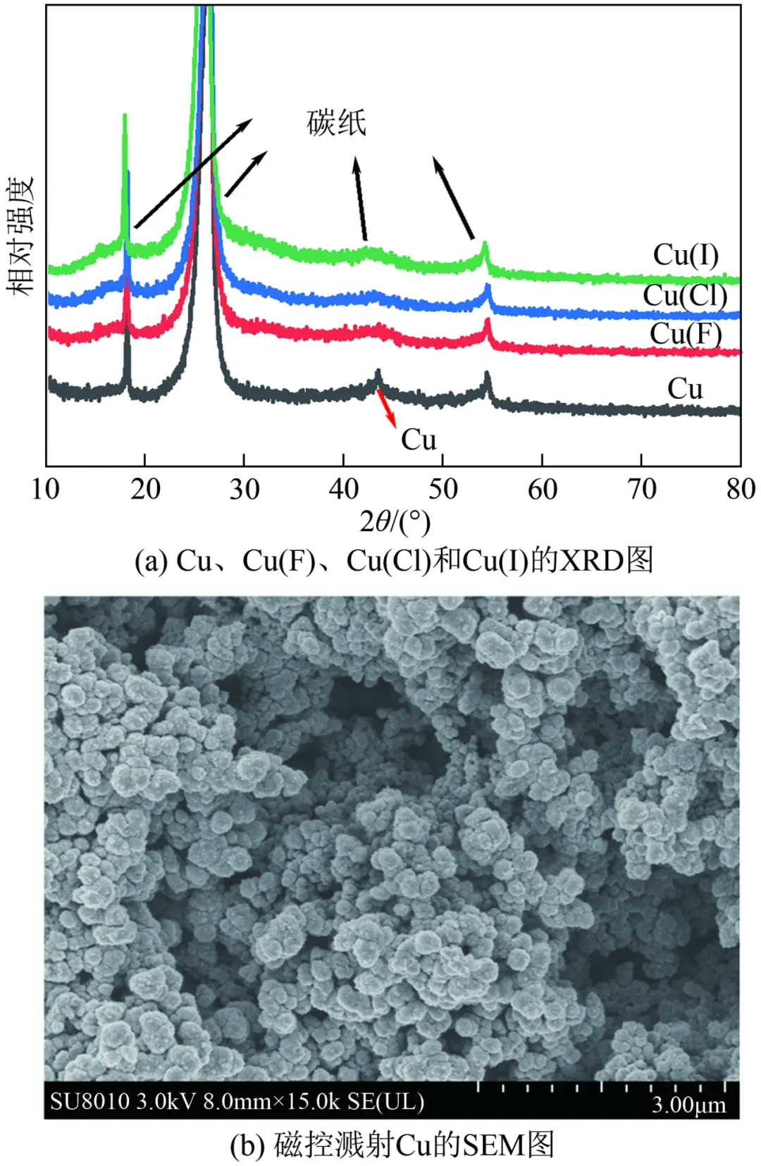 采用高真空磁控溅射镀膜系统(TRP450,中国)、X射线衍射谱(XRD,Bruker D8 Discover,德国)、扫描电镜(SEM,SU8010,日本)、透射电镜(TEM,JEM-2100,日本)和X射线光电子能谱(XPS,VG Scientific,英国)对催化剂的组成、形貌和晶体结构进行了表征。采用安捷伦气相色谱(HS-GC,中国)、万通离子色谱(930 Compact IC Fle,瑞士)和原位拉曼(Raman)光谱(Renishaw,英国)观察了在波长为785nm的激光激发下电催化CO还原(CORR)过程中中间体的吸附行为。