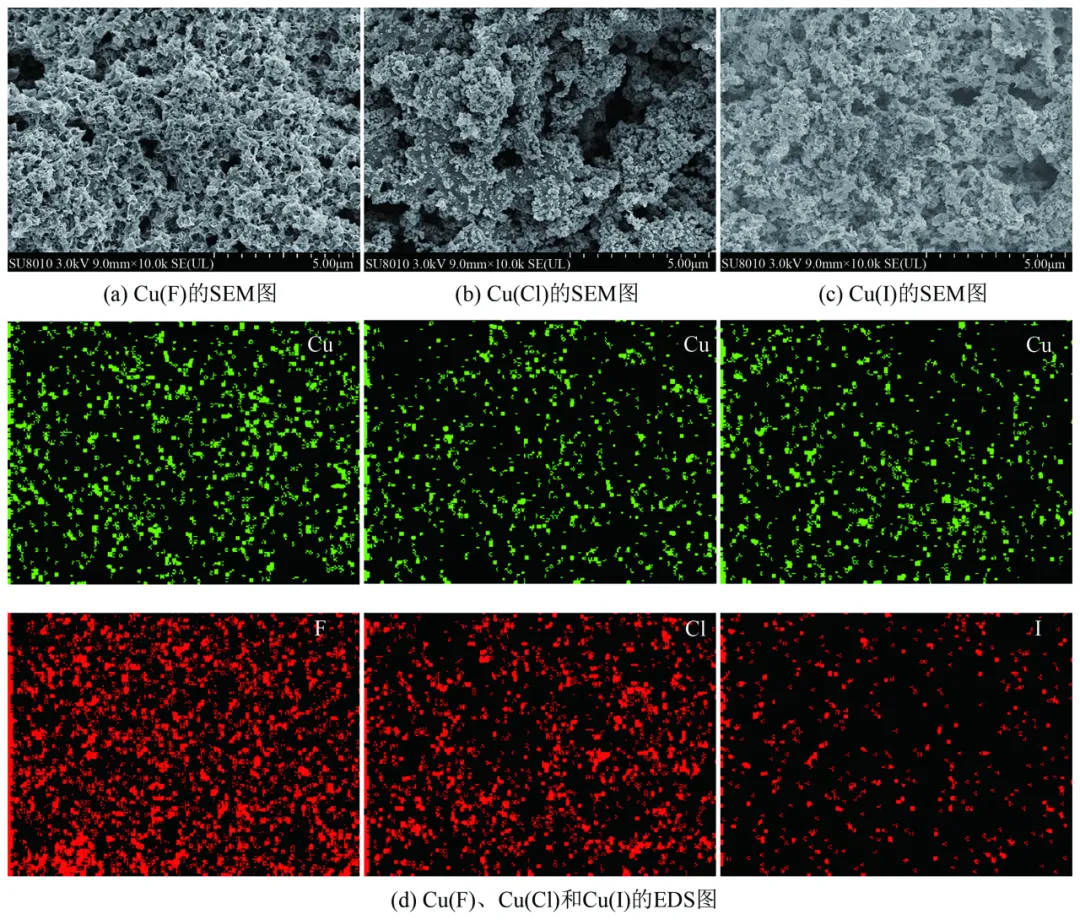 用扫描电子显微镜(SEM)表征样品表面形貌,如图2所示。卤化物Cu(F)、Cu(Cl)和Cu(I)展现出类似的纳米颗粒堆积结构。元素分析(EDS)表明,F、Cl和I在Cu(F)、Cu(Cl)和Cu(I)中均匀分布。其中F、Cl和I在Cu(F)、Cu(Cl)和Cu(I)中表现出接近的比例,分别为28.6%、19.6%和19.9%(表1)。