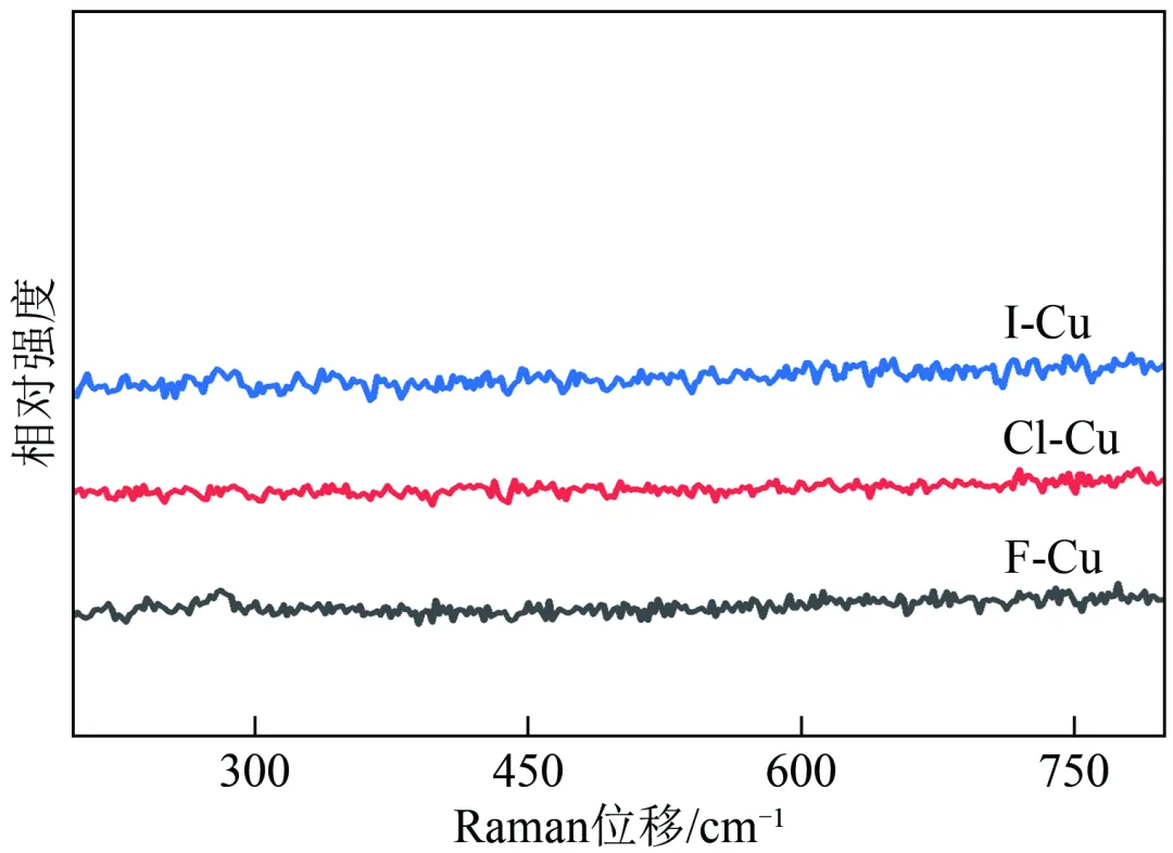 图6 F-Cu、Cl-Cu和I-Cu的Raman谱图