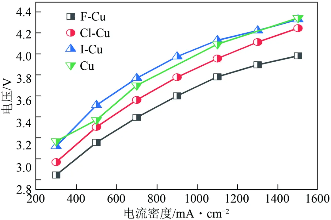 图7 F-Cu、Cl-Cu和I-Cu的CO还原电压随电流变化曲线