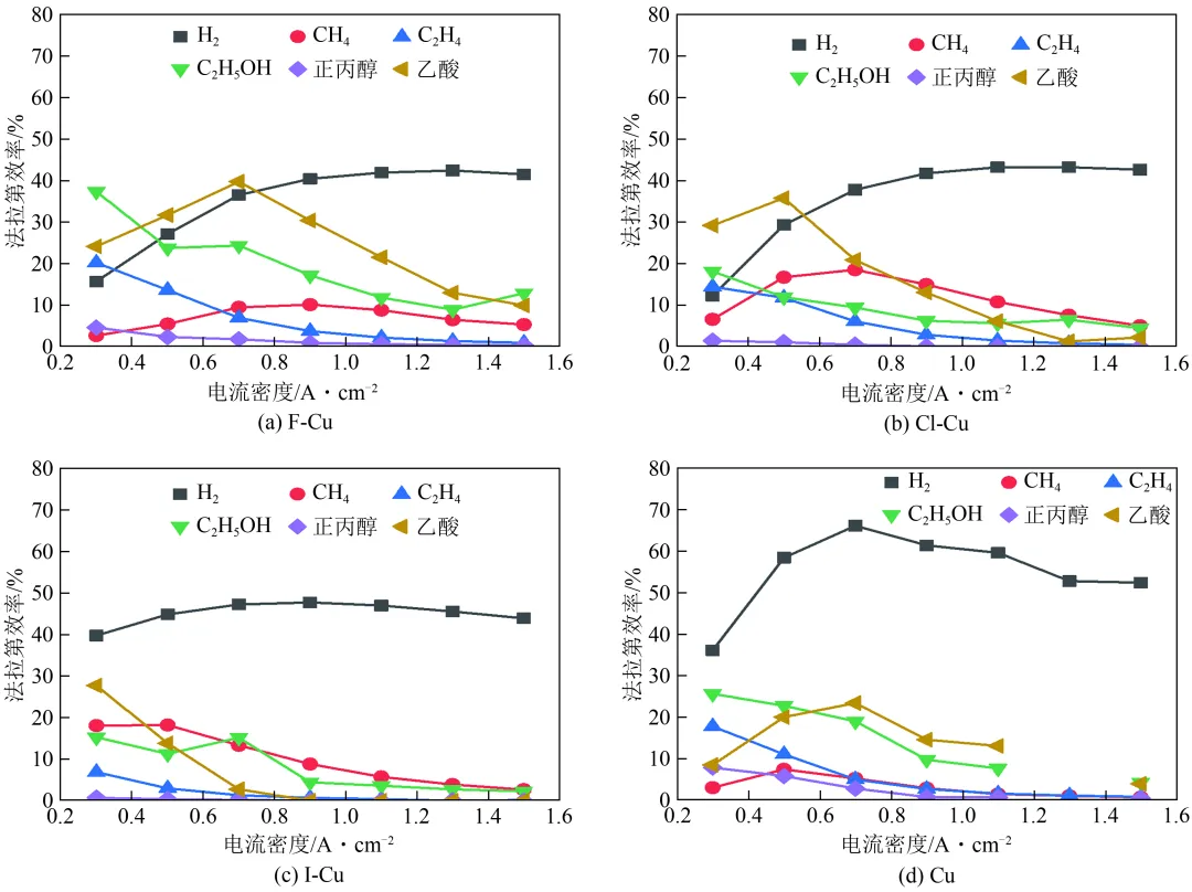 图8 F-Cu、Cl-Cu、I-Cu和Cu在膜电极反应器中的CO还原活性