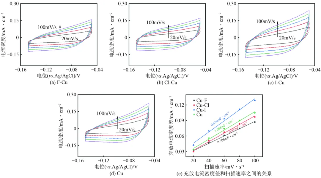 图9 F-Cu、Cl-Cu、I-Cu和Cu在Ar饱和0.1mol/L KHCO3中不同扫描速率下的CV曲线及充放电流密度差和扫描速率之间的关系