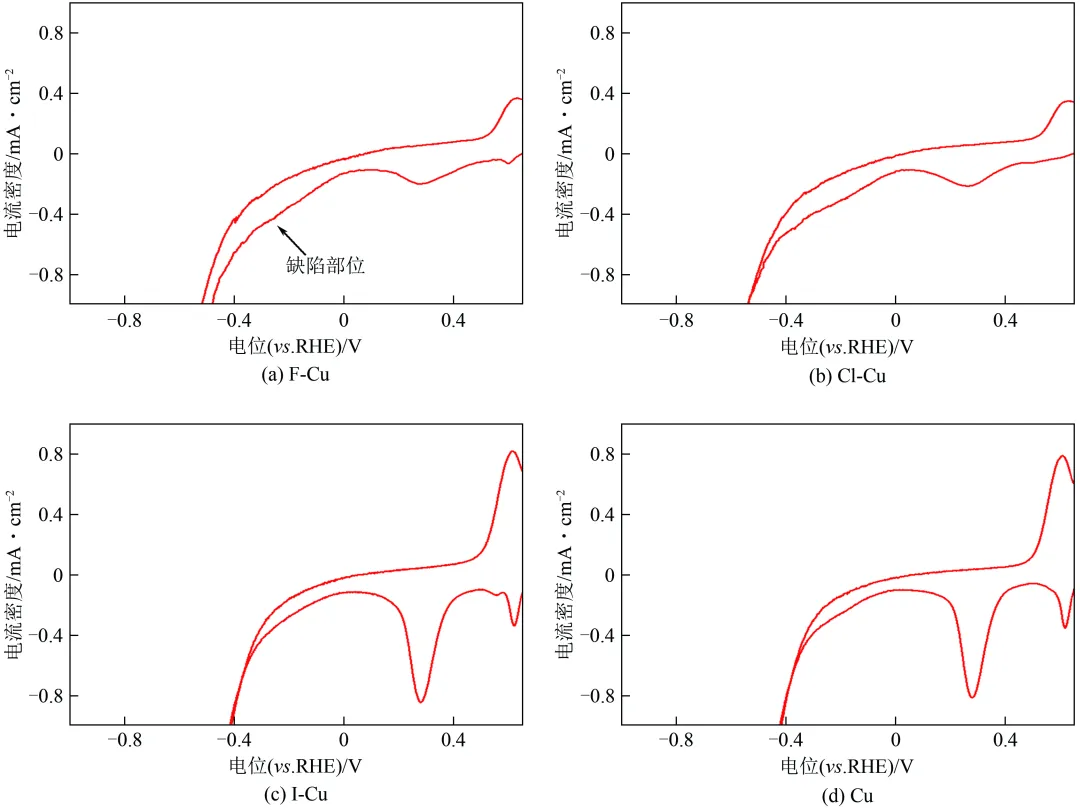 图10 F-Cu、Cl-Cu、I-Cu和Cu在Ar饱和0.1mol/L KHCO3中循环伏安曲线
