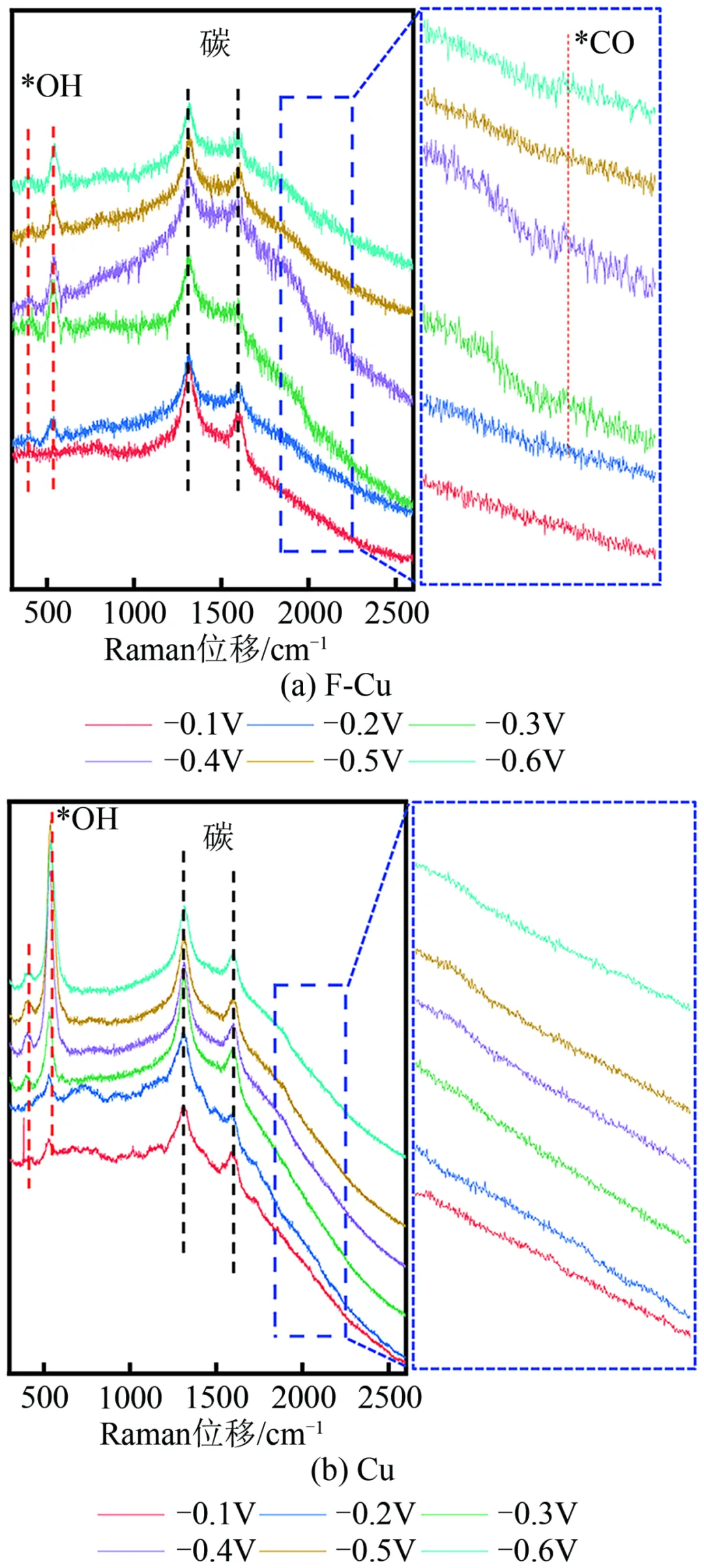 为了探究催化剂表面粗糙度对其活性的影响,在Ar饱和的0.1mol/L KHCO3溶液中对催化剂双电层电容进行测试,用于代表其电化学活性面积。循环伏安测试区域为非法拉第区域。如图9所示,催化剂的双电层电容为充放电电流密度差值的一半和扫描速率之间的线性斜率。F-Cu、Cl-Cu、I-Cu和Cu的双电层电容分别为0.708mF/cm2、0.83mF/cm2、0.886mF/cm2和1.008mF/cm2,说明F-Cu具有较小的电化学活性面积。因此,电化学活性面积不是其具有较好CO还原制备乙酸活性的原因。Cu缺陷位点对CO具有较好的吸附,有利于促进乙酸的生成,进一步采用在Ar饱和的0.1mol/L KHCO3溶液中的循环伏安测试考察催化剂表面的缺陷位点,结果如图10所示。其中,在-0.2V出现的还原峰代表了氧化的缺陷位点的还原。在-0.2V位置,F-Cu表现出比其他催化剂更明显的还原峰,说明F-Cu具有更多的缺陷位点,从而促进了CO还原制备乙酸。进一步在催化过程中收集原位反应拉曼光谱,揭示F-Cu催化CO还原的过程以及明确其具有更好CO还原制备乙酸活性的原因。如图11所示,在393cm-1和541cm-1处的峰源自电解液中的OH-吸附,而在1315cm-1和1597cm-1处的峰则为碳纸基底的峰。此外,在F-Cu的2096cm-1处可观察到对应于线性吸附的CO的伸缩振动峰,进一步验证了F-Cu暴露出更多的缺陷位点,有利于CO吸附,从而促进了CO还原制备乙酸。