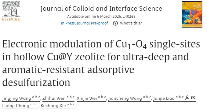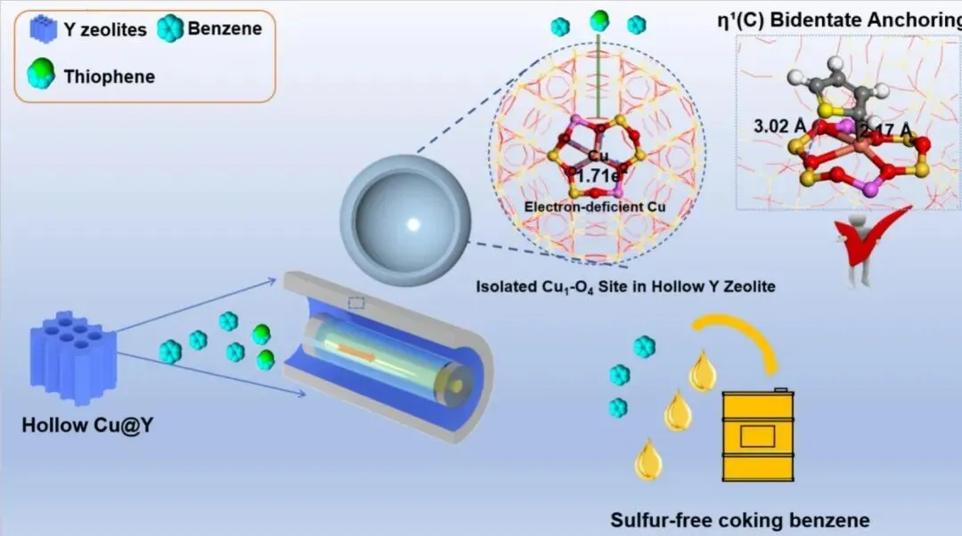高纯度焦化苯的深度脱硫是污染控制领域的重要前沿课题。焦化苯经萃取蒸馏后苯浓度极高,其中噻吩等含硫污染物与苯结构相似,会显著阻碍苯在下游工艺(如环己酮肟、马来酸酐和苯胺生产)中的应用,这些工艺通常要求噻吩含量低于0.01 ppm。中国年产焦化苯约450万吨,开发高效脱硫技术已成为21世纪的关键研究领域。传统加氢脱硫难以达到如此低的硫含量阈值,而吸附脱硫因操作条件温和、环境友好、效率高等优势成为极具竞争力的替代方案。铜改性Y沸石(CuY)因优异的脱硫性能而备受关注,但其精确构效关系仍不明确,主要由于铜物种配位环境复杂、动态迁移及混合价态(Cu⁺/Cu²⁺)共存。现有研究多强调Cu⁺通过π络合作用作为脱硫活性位点,但实验硫容量常超过理论预测值,暗示其他活性位点(如Brønsted酸位点和Cu²⁺物种)的参与。具有精确调控配位环境的单原子吸附剂代表了一个有前景的研究方向,但传统合成方法常导致单原子被包埋、无法接触,且超微孔限制分子扩散,降低原子利用效率。因此,将明确界定的单原子位点与高开放性结构相结合,是实现高选择性和高容量的关键挑战。