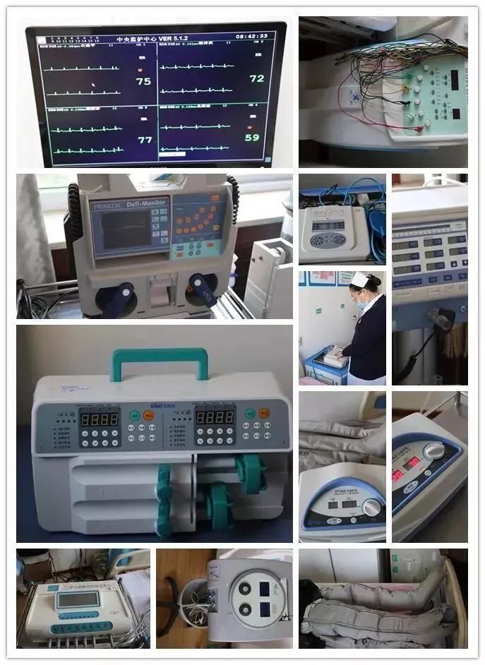 科室设备:24小时动态心电图仪、动态血压监测仪、中央监护、子午流注,经络导频治疗仪、呼吸机、直流电药物离子导入治疗仪、MG-201脑电仿生电刺疗仪、除颤仪、心电图机、艾灸治疗仪、气压治疗仪、电动吸引仪、高压离子雾化等。
