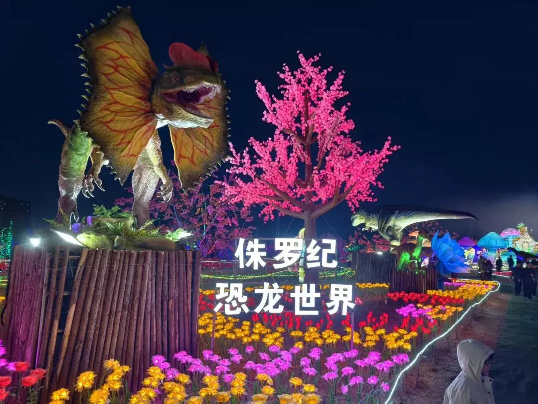 2月19日下午五点,我们驱车抵达千灯会,此时太阳尚未落山,灯光还未完全亮起,我们便静待夜幕降临。七点过后,灯光效果渐入佳境,整个灯会现场成了光影的海洋。我们最先打卡的是 “昆虫世界的光影奇妙体验” 区域,光影技术打造的蜻蜓、蜜蜂、蚂蚱等各式昆虫,在花海间灵动飘动、发出逼真的鸣叫声,栩栩如生;不远处,大小不一的模拟恐龙摆着头、甩着尾,发出阵阵嘶吼,引得游客纷纷驻足围观。