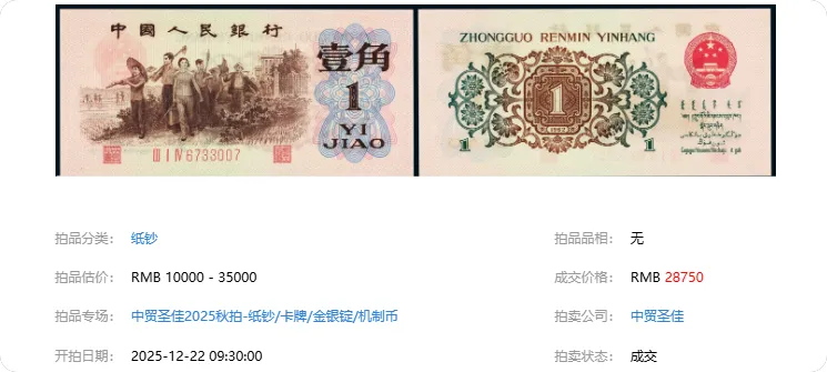 1962年 三版人民币壹角背绿水印 PMG·66EPQ中贸圣佳2025秋拍-纸钞/卡牌/金银锭/机制币成交价格: RMB 28750。