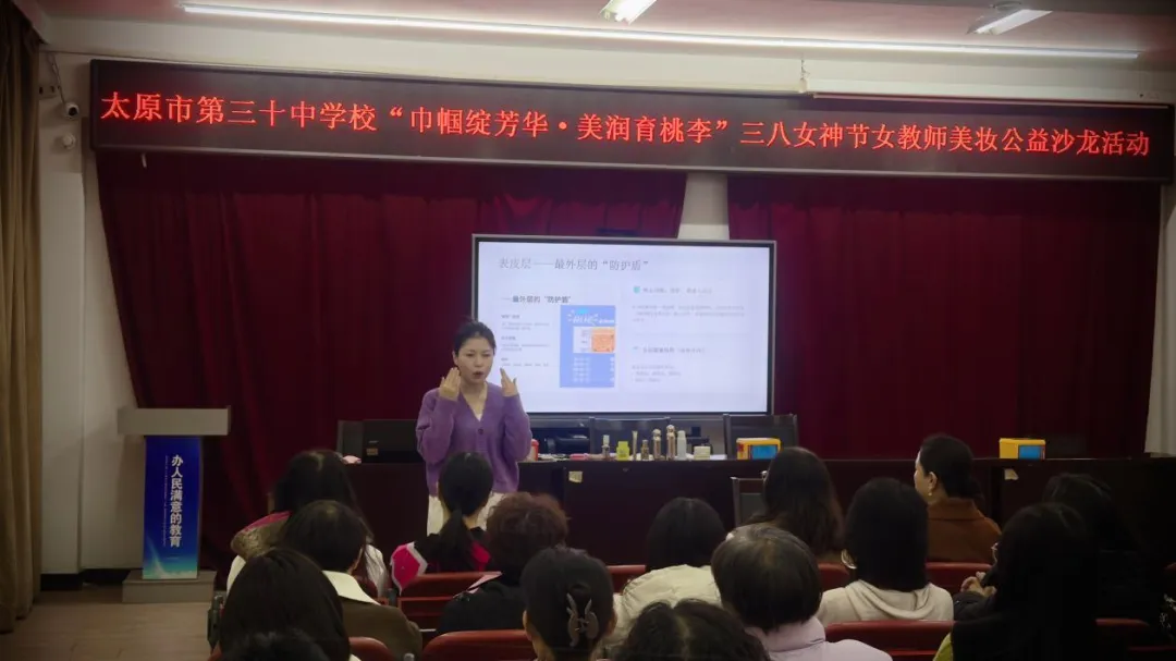 春风送暖,芳华绽放。在第116个三八国际劳动妇女节到来之际,太原市第三十中学校为全体女教师送上暖心祝福与专属礼遇。「三八女神节女教师美妆公益沙龙」温馨举办,以科学护肤、实用美妆为载体,向辛勤耕耘在教育一线的女教师们致敬。
