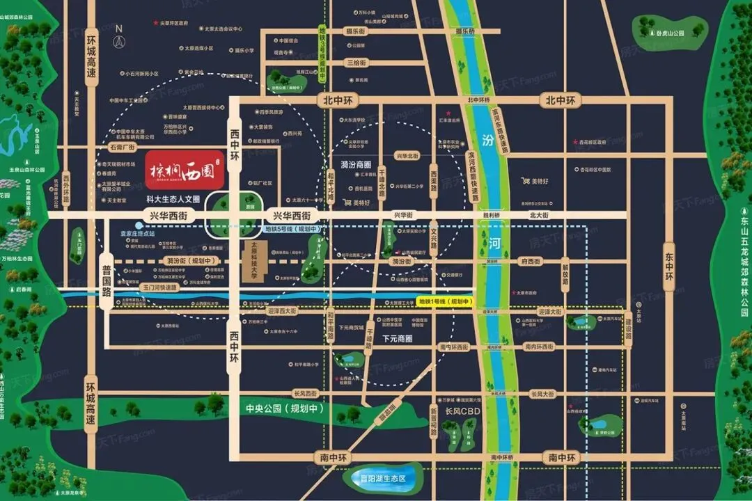 周边公园:玉泉山森林公园和西山万亩生态园、玉门河公园、漪汾公园等周边医院:三甲医院:太原市第四人民医院、山大三院西院、山西心脑血管医院、山西中医学院附属医院、还有正在筹建的太原市第三人民医院;二甲医院:中铁十二局中心医院、太原市和平医院、万柏林区中心医院等。周边学校:幼儿园:太原科技大学-科大幼儿园,晋西西兴苑幼儿园,太铝幼儿园;中小学:万柏林第三实验小学、万柏林区东社小学,兴华西街小学,万柏林区外国语小学,马蹄莲小学、万柏林实验中学、市二十中、市六十一中;交通状况:
