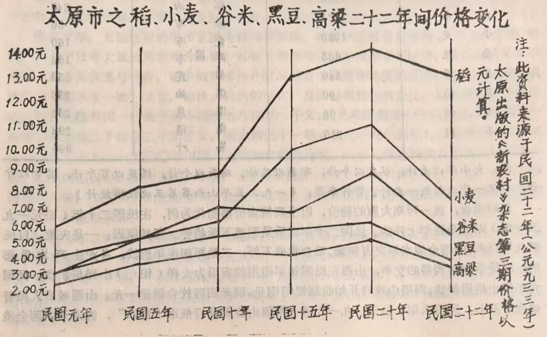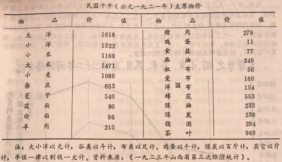 据统计,民国后期三年,太原物价指数,若以1946年为100计,1947年为1859.82,1948年达3584354。各类商品价格涨幅为:粮食37672倍,副食品53321倍,烟酒茶100011倍,衣着11452倍,燃料11696倍,日用品11452倍,医药用品65246倍,文教用品14194倍,服务支出20490倍,电影票高至11200万元一张,理发需9000万元。