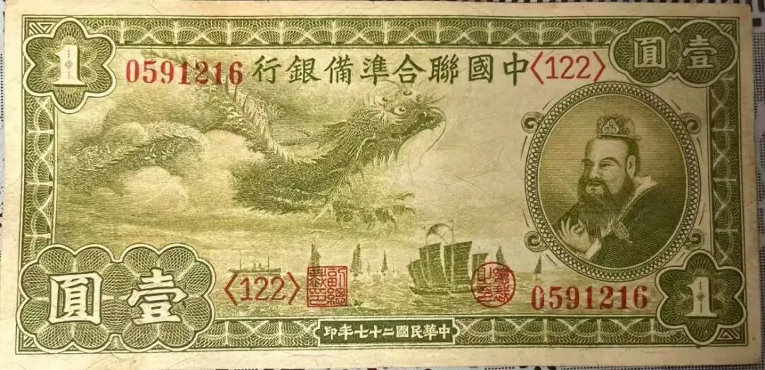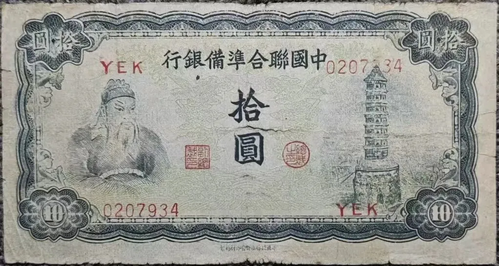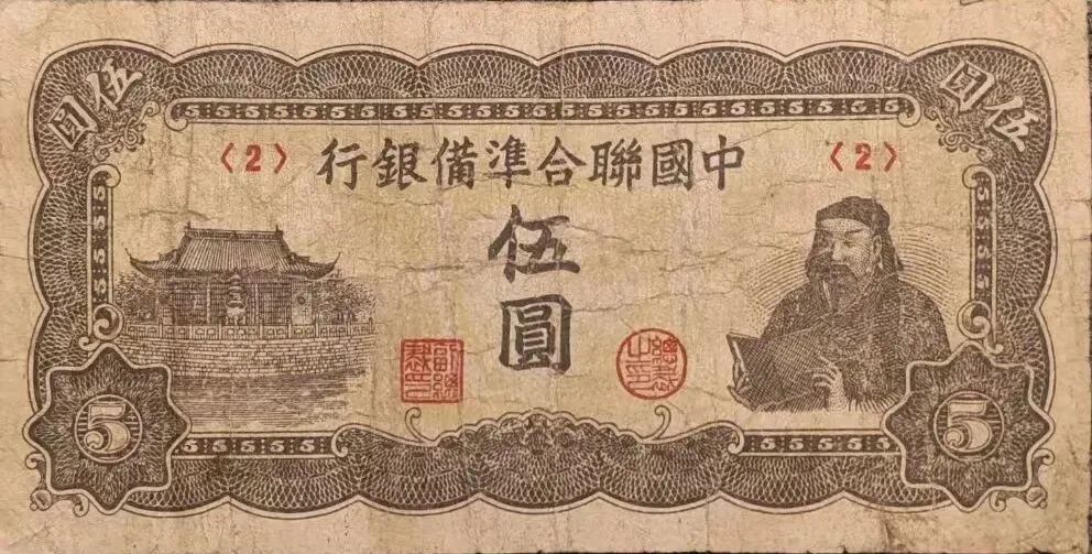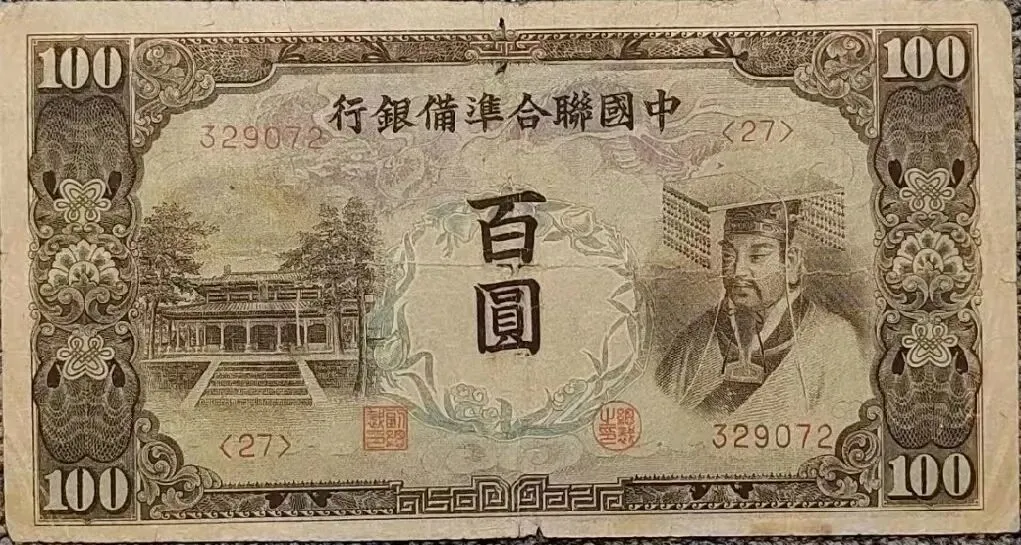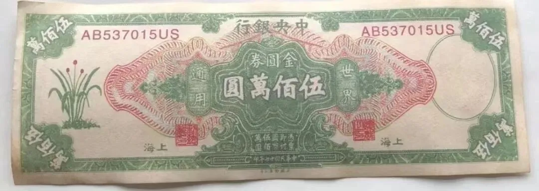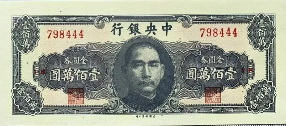 上两图为国民政府中央银行发行的壹佰万圆和伍佰万圆金圆券。1948年,法币通胀达300万倍,财政濒临破产,国民政府强推金圆券改革,从1948年8月至1949年7月,累计发行约130兆元,导致物价飞涨,货币形同废纸