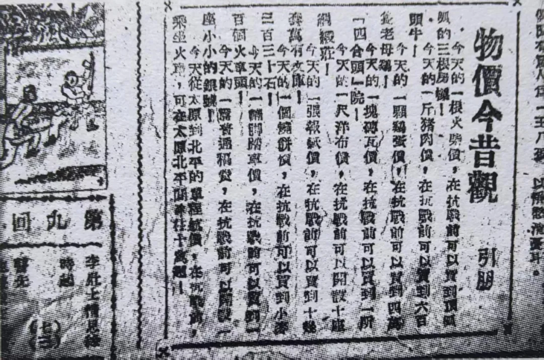 1948年3月31日《民众日报》载文《物价今昔观》,将当时物价与抗战前进行了对比:当时1根火柴的价格,抗战前可买3根房梁!1斤猪肉的价格,抗战前可买600头牛!1颗鸡蛋的价格,抗战前可买4万只老母鸡!1块砖瓦的价格,抗战前可买一所四合院!1尺洋布的价格,抗战前可设十座绸缎庄!1张报纸的价格,抗战前可买十几套“万有文库”书籍!1个烧饼的价格,抗战前可买小麦330石!1辆自行车的价格,抗战前可买100个火车头!一篇普通稿费,抗战前可设一座小银号!从太原到北平的车票,抗战前乘坐火车可在太原北平之间来往十万趟!