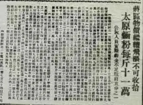 1947年1月17日至2月14日的《晋绥日报》,对太原物价进行了连续报道。太原大街小巷都筑碉堡,有的商号每天花一至二万元雇人修。官秤改13.5两为一斤。蒋管区各地物价飞涨,粮食布匹均涨10%以上。2月5日,太原物价暴涨,小麦每斤涨价达25000元,上涨80%;大米每斤35000元,上涨75%。蒋管区法币11000元兑一美元,转十日又高出1000元,好些商品从12日起涨价一倍。