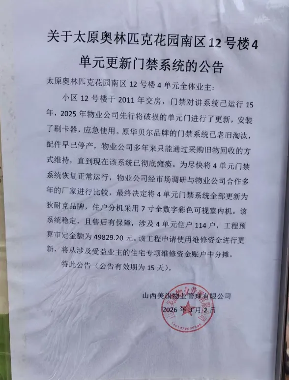 关于太原奥林匹克花园南区12号楼4单元 更新门禁系统的公告 太原奥林匹克花园南区12号楼4单元全体业主: 小区12号楼于2011年交房,门禁对讲系统已运行15年,2025年物业公司先行将破损的单元门进行了更新,安装了刷卡器,应急使用。原华贝尔品牌的门禁系统已老旧淘汰,配件早已停产,物业公司多年来只能通过采购旧物回收的方式维持,直到现在该系统已彻底瘫痪。为尽快将4单元门禁系统恢复正常运行,物业公司经市场调研与物业公司合作多年的厂家进行比较,最终决定将4单元门禁系统全部更新为狄耐克品牌,住户分机采用7寸全数字彩色可视室内机。该系统稳定,且售后有保障,涉及4单元住户114户,工程预算审定金额为49829.20元。该工程申请使用维修资金进行更新,将从涉及受益业主的住宅专项维修资金账户中分摊。特此公告(公告有效期为15天)。 |
