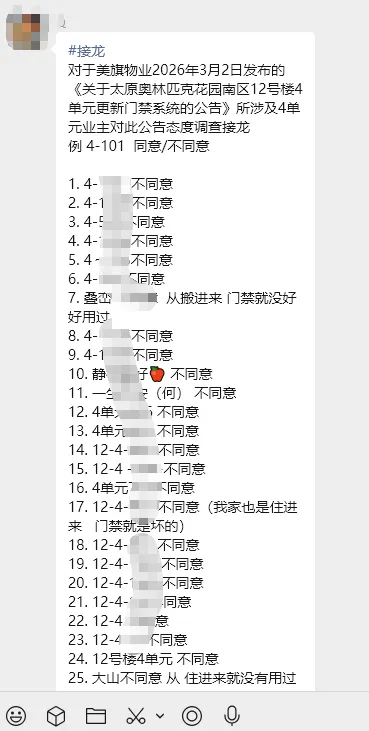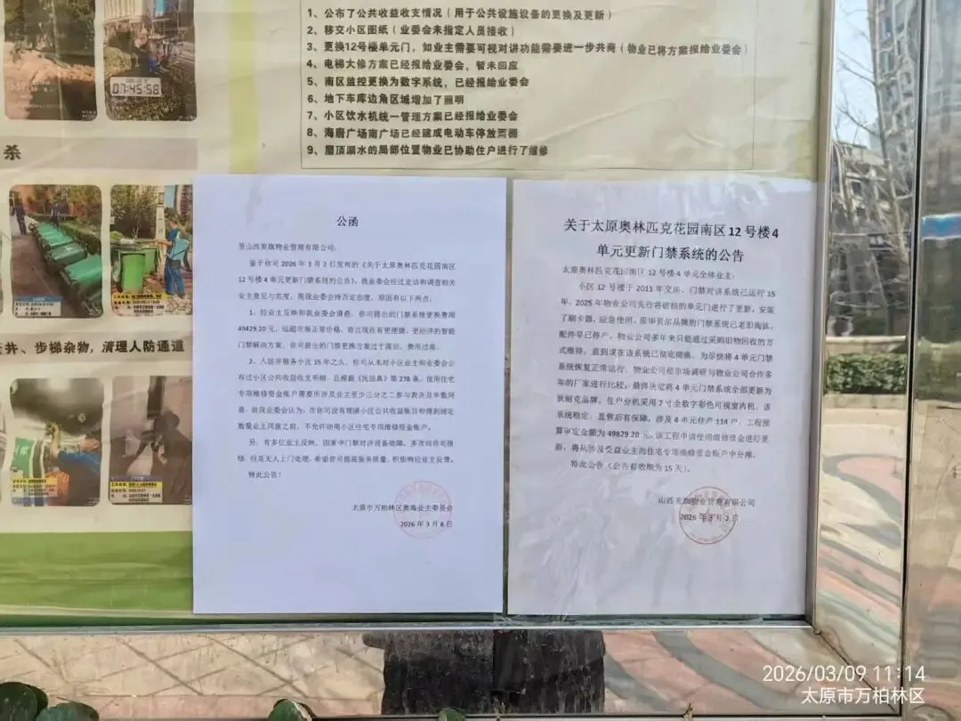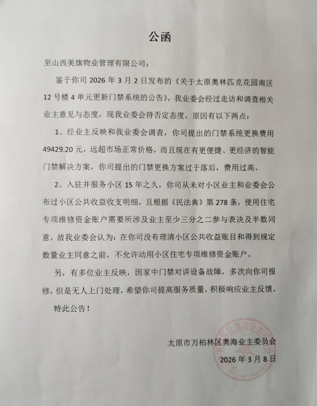 公函至:山西美旗物业管理有限公司 鉴于你司2026年3月2日发布的《关于太原奥林匹克花园南区12号楼4单元更新门禁系统的公告》,我业委会经过走访和调查相关业主意见与态度,现我业委会持否定态度,原因有以下两点: 1、经业主反映和我业委会调查,你司提出的门禁系统更换费用49429.20元,远超市场正常价格,而且现在有更便捷、更经济的智能门禁解决方案,你司提出的门禁更换方案过于落后,费用过高。 2、入驻并服务小区15年之久,你司从未对小区业主和业委会公布过小区公共收益收支明细,且根据《民法典》第278条,使用住宅专项维修资金账户需要所涉及业主至少三分之二参与表决及半数同意,故我业委会认为:在你司没有理清小区公共收益账目和得到规定数量业主同意之前,不允许动用小区住宅专项维修资金账户。 另,有多位业主反映,因家中门禁对讲设备故障,多次向你司报修,但是无人上门处理,希望你司提高服务质量,积极响应业主反馈。 特此公告! 太原市万柏林区奥海业主委员会 2026年3月8日 |
