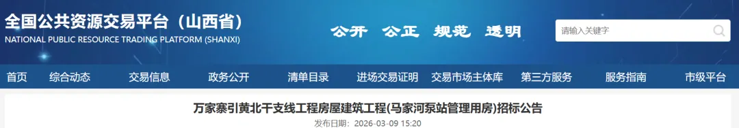 3月9日,山西省公共资源交易中心消息,万家寨引黄北干支线工程房屋建筑工程(马家河泵站管理用房)开始招标。