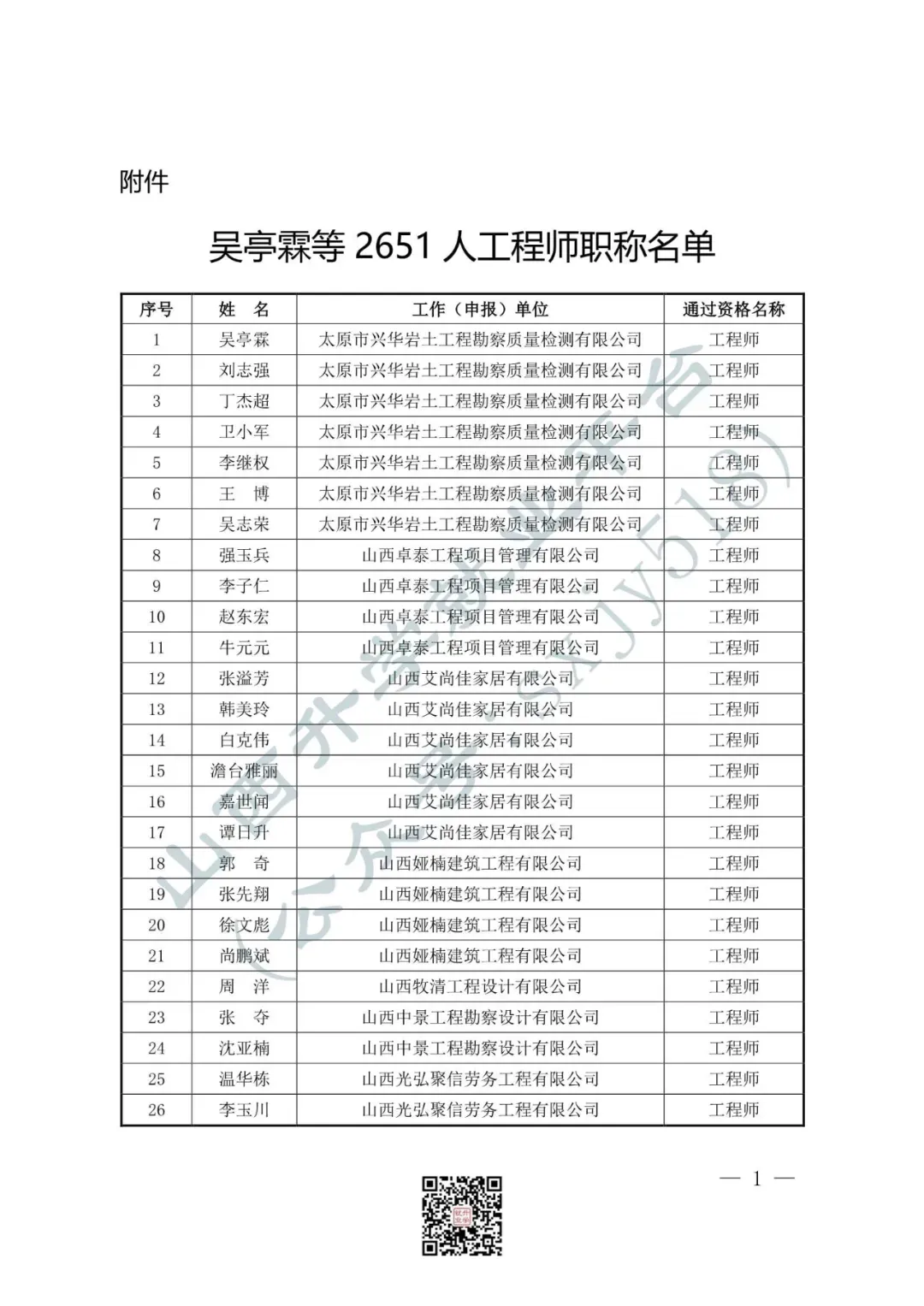 经审核,同意太原市自由职业者工程系列中级职称评审委员会于2026年2月12日评审通过的吴亭霖等2651人工程师职称评审结果,现予以公布。太原市人力资源和社会保障局