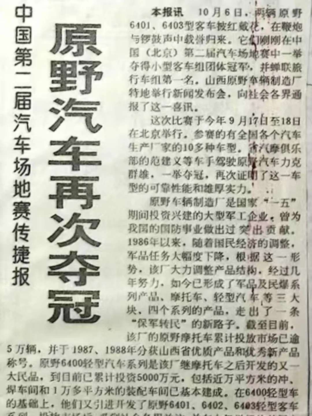 1993年10月,原野车在中国第二届汽车场地赛中获得小客车组团体冠军,并蝉联旅行车组第一名。我在当年10月8日的《太原日报》上报道了这一盛况。