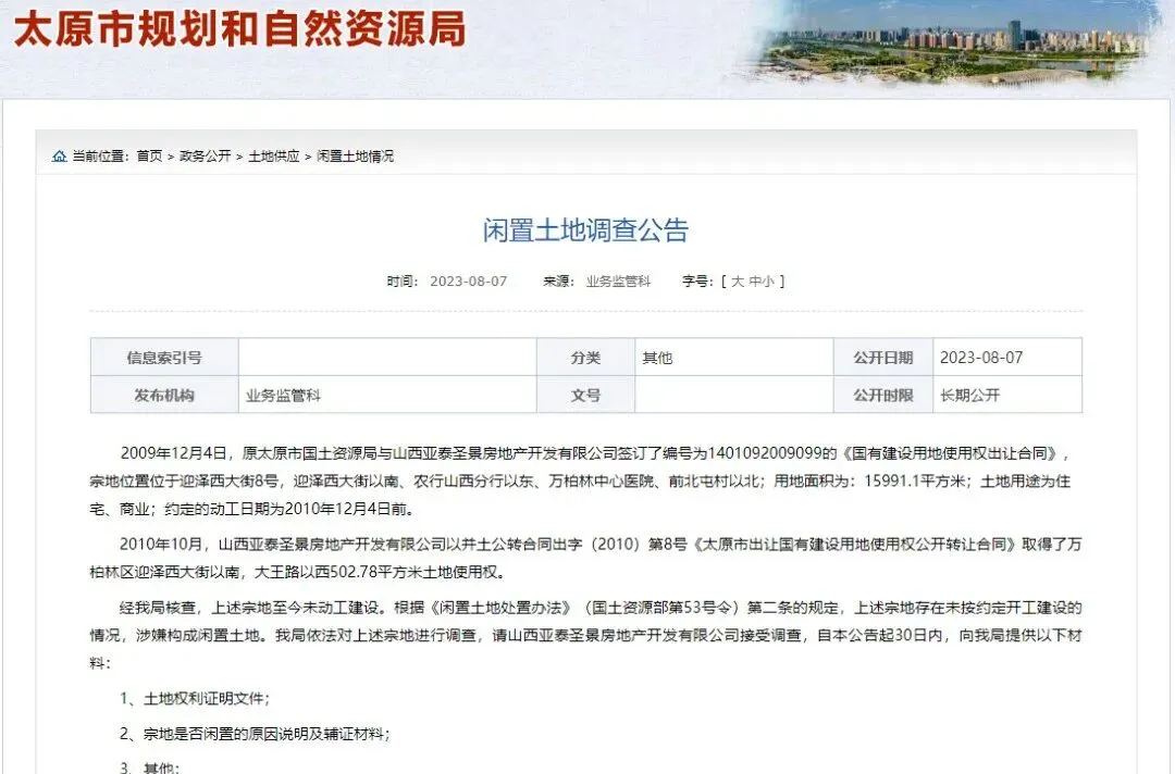 太原迎泽西大街一地块因13年未开发,近日被太原市规划和自然资源局公示,将接受调查。根据相关规定,该地块若未按规定缴纳闲置费且继续闲置,或将被收回。8月7日,太原市规划和自然资源局发布《闲置土地调查公告》,山西亚泰圣景房地产开发有限公司涉嫌构成闲置土地。根据公告,山西亚泰圣景房地产开发有限公司于2009年12月4日与原太原市国土资原局签订了土地使用权出让合同,获得迎泽西大街8号,迎泽西大街以南、农行山西分行以东、万柏林中心医院、前北屯村以北一面积为15991.1平方米的地块使用权,地块用途为住宅、商业用途,双方对土地的动工日期进行了约定,为2010年12月4日前。随后的2010年10月,亚泰圣景公司又取得了万柏林区迎泽西大街以南、大王路以西502.78平方米地块。但上述宗地至今未动工建设,涉嫌构成闲置土地。在公告公示30日之内,亚泰圣景需向太原市规划和自然资源局提供土地权利证明文件、宗地是否闲置的原因说明及辅证,若未在规定时限内向太原市规划和自然资源局提供相关证明,将根据其他调查材料进行闲置土地认定。