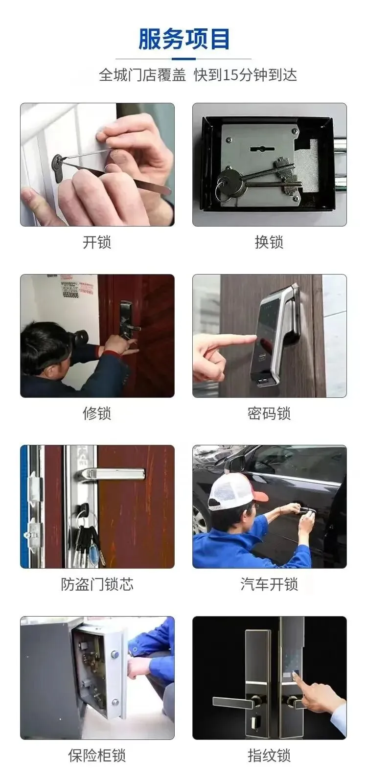 开锁服务: 提供家庭门锁、汽车锁、保险柜等各种锁具的开锁服务,技术高超,保证不损坏锁具。