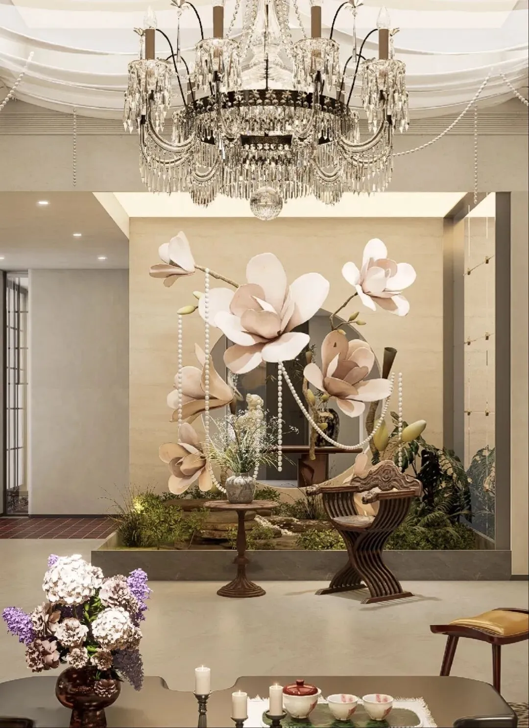 宸汐美学空间在会客区的处理上,把“会客感”和“沙龙感”一起考虑进去。顶部帘幔、水晶灯、深木色背景、花艺和座椅关系,共同构建出一种既有仪式感、又不会让人紧张的交流氛围。