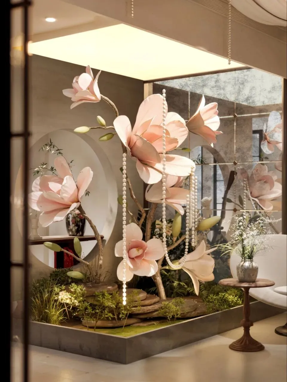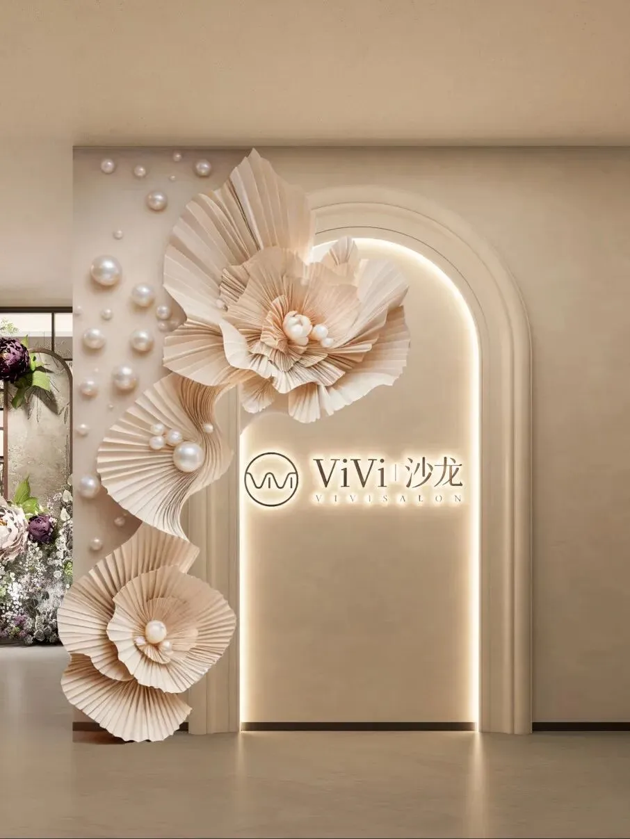 这里的花艺不是普通点缀,而是被放大成整个空间的主视觉。它既有艺术装置的张力,又保留了女性空间应有的柔美和精致感,让整个项目从第一眼开始就有明显记忆点。