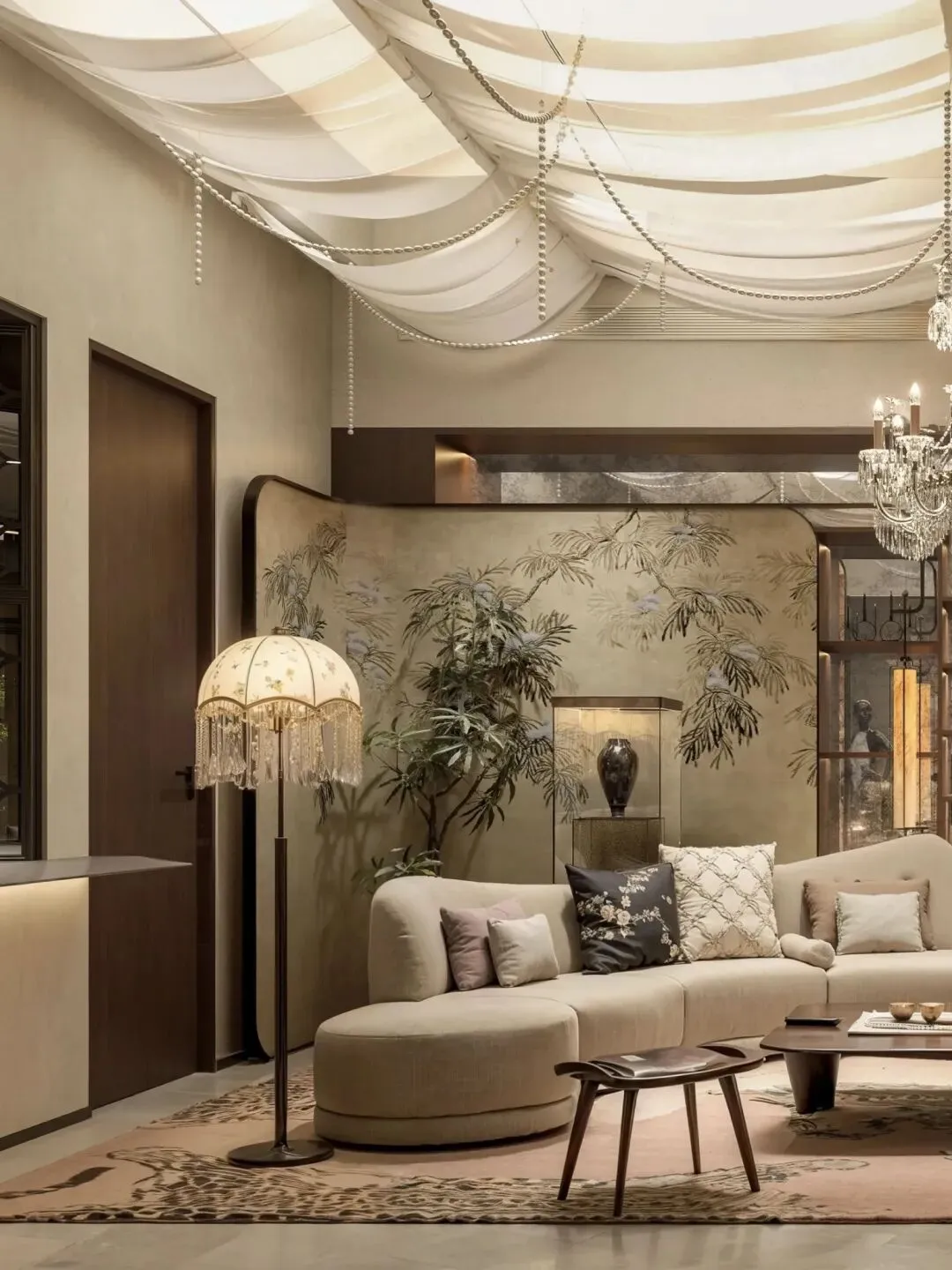 宸汐美学空间的一部分区域,通过弧形沙发、柔软面料、屏风围合、落地灯和背景墙之间的关系,营造出更安静、更放松、更包裹的状态。