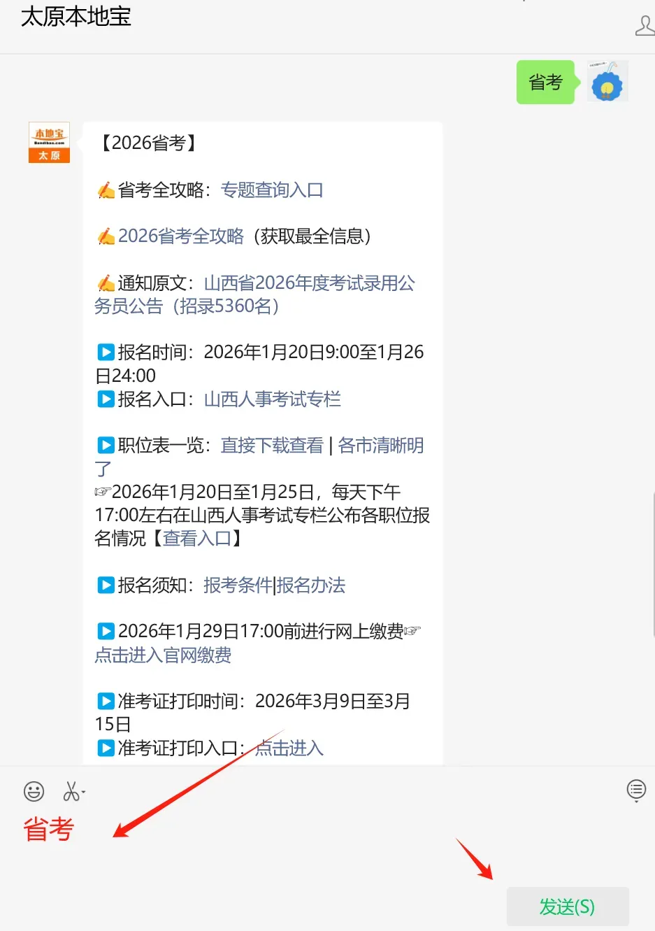 在聊天框发送【省考】获取
