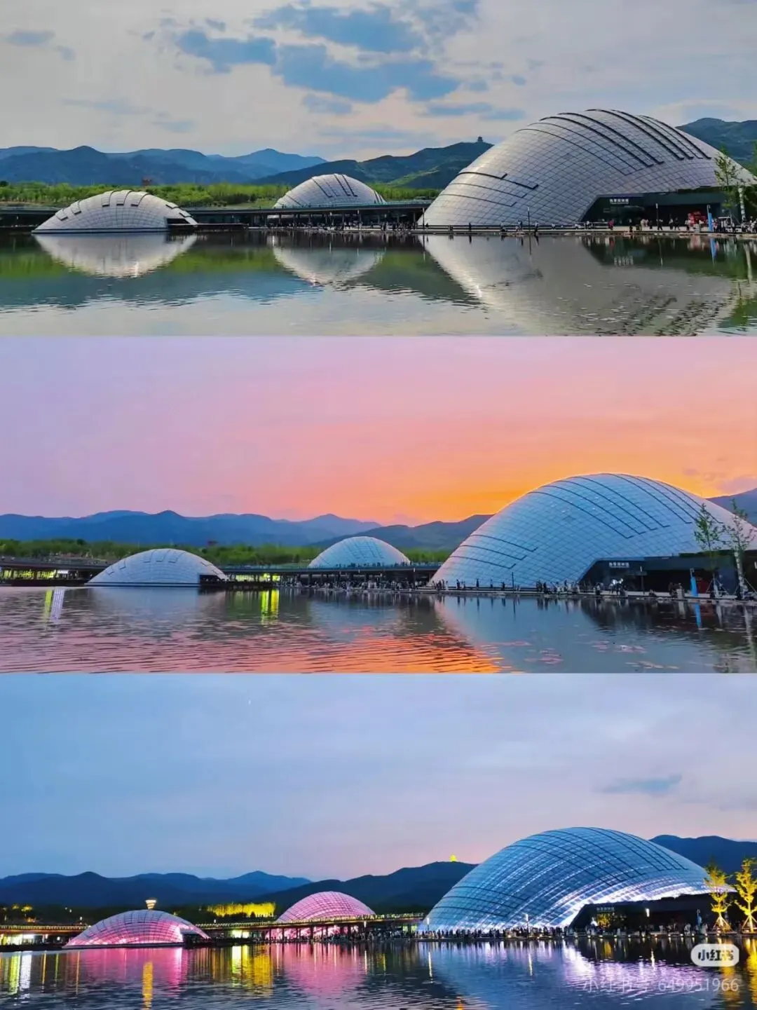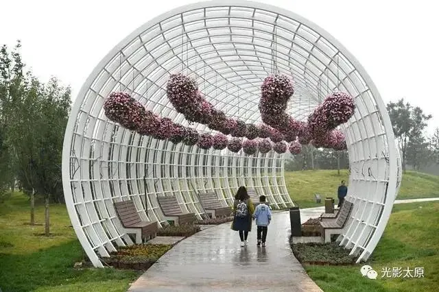 进入植物园,映入眼帘的是五彩缤纷的花坛、波光粼粼的景观湖以及太原植物园的标志性建筑——三座外形酷似“露珠”的建筑,分别是热带雨林馆、沙生植物馆、珍稀植物及四季花卉馆。