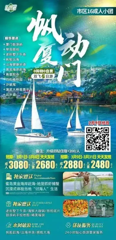 >太原到厦门旅游纯玩品质团双飞5日游特惠2000+,0购物0自费,帆船赶海/出海冲浪/蜜岛黄金海岸赶海/地笼抓虾捕蟹,体验当地人的生活