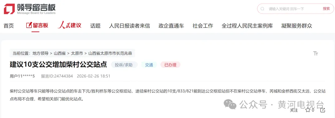 记者从人民网领导留言板获悉,网友建议增设太原市柴村公交站点。