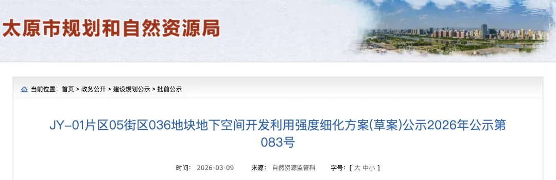 公告显示:南屯城市公共空间改造利用项目为我市2026年重点基础设施项目,拟利用长风公园地下空间进行建设,为推动项目建设,太原市园林局申请编制JY-01片区05街区036地块地下空间利用强度细化方案。