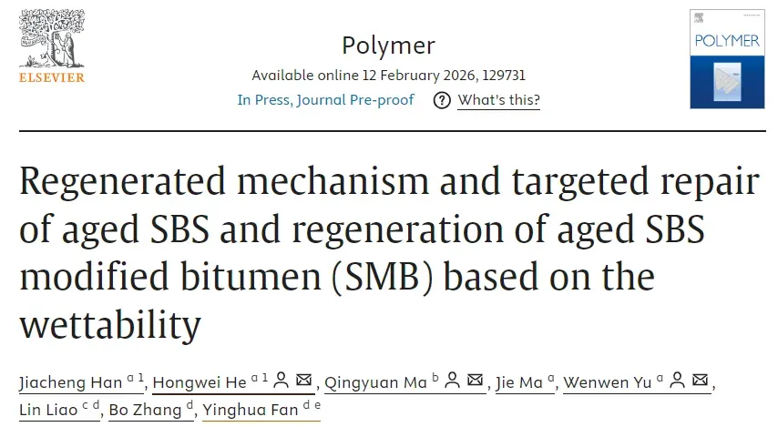 近日,太原理工大学何宏伟副教授在《Polymer》期刊上发表了题为Regenerated mechanismand targeted repair of aged SBSand regeneration of aged SBS modified bitumen (SMB)based on the wettability的文章。如图1,该论文以90号基质沥青、线型SBS为原料制备SBS 改性沥青(SMB),经压力老化得到老化SMB(SMB-aged);选取废机油(WEO)、植物油(VO)为沥青组分调节剂,三羟甲基丙烷三缩水甘油醚(TMPTE)、1,4 - 丁二醇二缩水甘油醚(BUDGE)为SBS 环氧型结构修复剂,搭配BDMA 催化剂制备复合再生剂,对SMB-aged 开展再生研究。系统分析油分对SBS的保护作用、再生剂对老化SBS的结构修复机制及复合再生剂对SMB-aged的再生效果,揭示润湿性对SBS靶向修复及SMB整体再生的影响规律。结果表明,表面张力更低、润湿性和渗透性更优的WEO对SBS的长期抗老化保护作用显著优于VO,TMPTE和BUDGE均能通过环氧基团与老化SBS的羟基、羧基反应重建其三嵌段结构与网络,且TMPTE修复效果更突出。