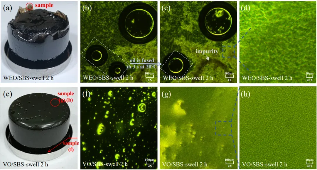 图2不同油 / SBS 混合物的荧光显微镜(FM)图像及实物照片:(a) WEO/SBS 溶胀 2 h 后的实物照片;(b) WEO/SBS 的 4 倍荧光显微镜图;(c) WEO/SBS 静置 3 s 后的 4 倍荧光显微镜图;(d) WEO/SBS 的 40 倍荧光显微镜图;(e) VO/SBS 的实物照片;(f) VO/SBS 液体样品溶胀 2 h 后的 4 倍荧光显微镜图;(g) VO/SBS 固体样品溶胀 2 h 后的 4 倍荧光显微镜图;(h) VO/SBS 固体样品溶胀 2 h 后的 40 倍荧光显微镜图。