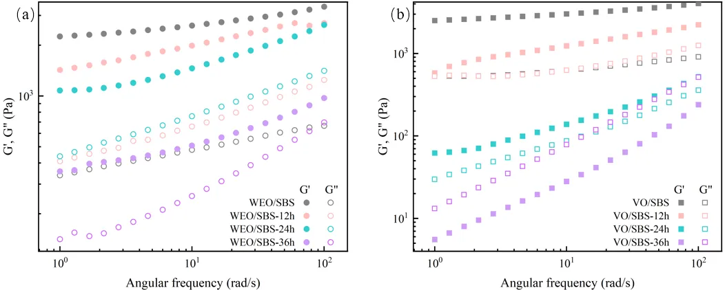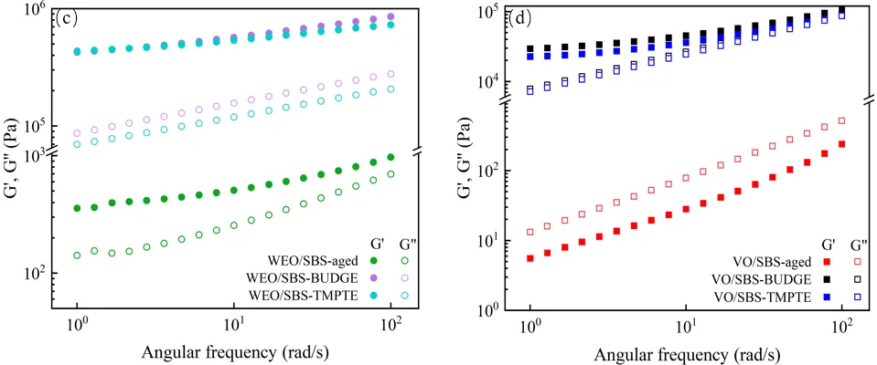 图4为SBS/油分混合物在老化和再生前后的模量图。图4a发现未老化时,G’ > G”,此时WEO/SBS呈弹性。随着老化时间的延长,G’越来越小,且G’和G”之间的差距越来越小,说明SBS在WEO中溶胀形成的网络结构逐渐被破坏。在图4b中,VO/SBS在老化时间达到36 h时,G” > G’,呈黏性,这也与实物照片相对应(图3c)。说明36 h时,WEO对SBS的抗老化保护作用大于VO。图4c和4d发现再生后,WEO/SBS和VO/SBS的储能模量恢复,呈弹性。说明BUDGE和TMPTE连接了老化SBS,实现了SBS网络结构的恢复。