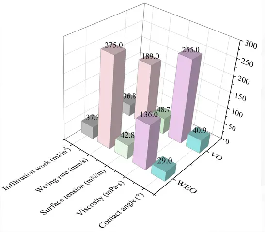 图5为WEO和VO在老化沥青中的润湿性能。接触角越小,表面张力越小,润湿速率越好,渗透功越大。可知,WEO的润湿速率和渗透功都优于VO。此外,发现黏度与润湿速率和渗透功成反比,黏度越小,渗透功和润湿速率越好。这是因为沥青中存在大量的微小空隙和孔隙。低黏度油分更容易通过毛细作用渗入沥青的微小孔隙和裂纹中,提升渗透性。且其分子运动速度更快,扩散能力更强, 能够更深入地进入沥青的内部结构,从而改善渗透性。此外,低黏度的油分更容易在沥青表面铺展开来,形成均匀薄膜。而且,其通常具有更低的表面张力,这使得它更容易在沥青表面上扩散并与其表面分子相互作用,增强润湿效果,从而改善润湿性。