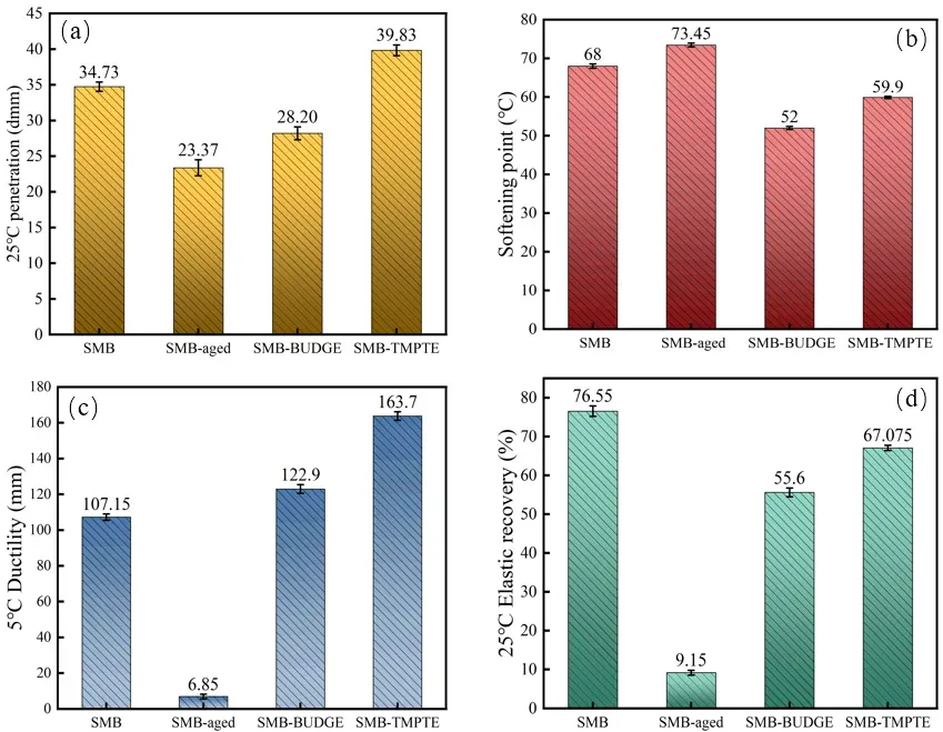 图6为不同SMB样品的物理性能。图6a发现老化后SMB的针入度降低,因为老化后轻组分的含量大大降低。再生后,SMB-TMPTE的针入度低于SMB-BUDGE,这可能是由于SMB-TMPTE中弹性成分含量高吸收了沥青中更多的轻质组分造成的。