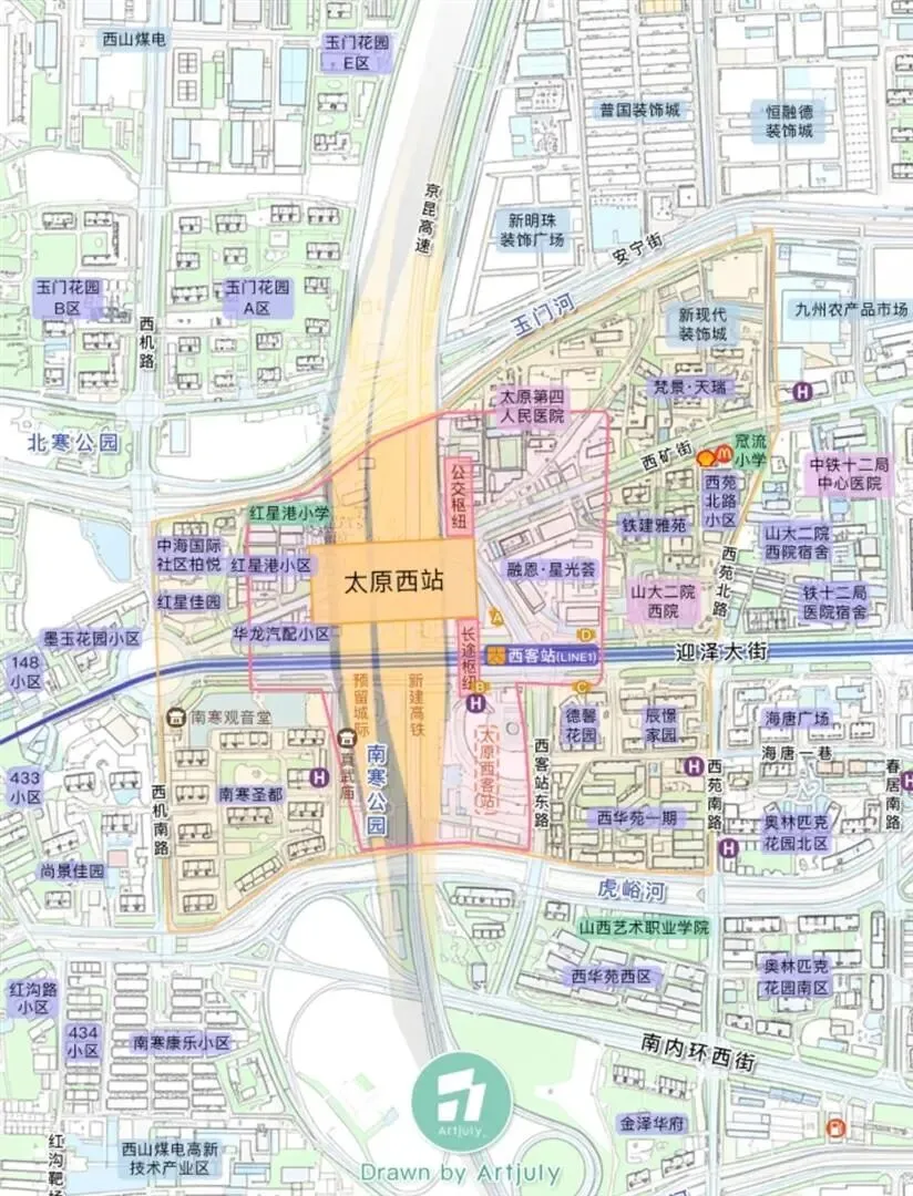 规划中的太原西站,就是要改变这个局面。 它的选址定在了万柏林区的迎泽西大街与绕城高速的交叉口附近。 这里位于河西片区的核心地带,靠近现有的西客站和山西医科大学第二医院南院。 根据规划,西站的站场规模将达到10台22线,这与目前太原南站的规模是一样的。 车站的设计采用了“站城融合”的理念,是一座高架车站,将“上跨”迎泽大街。 地上部分有四层,包括高架候车厅和商业配套;地下有两层,用于地铁换乘和停车场。 未来,这里将实现高铁、地铁、公交、长途客运等多种交通方式的“零距离”换乘。 地铁1号线已经确定将在这里设站并实现无缝衔接。