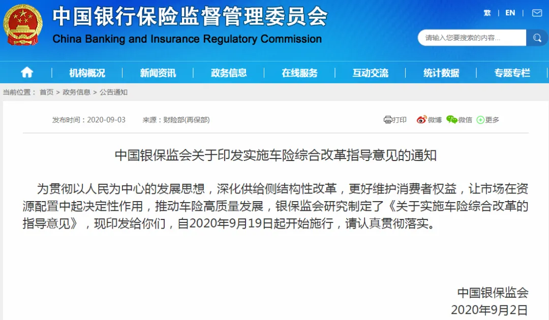 《指导意见》将于2020年9月19日开始实施。下一步,银保监会将指导各银保监局、财产保险公司和相关单位做好改革各项工作,确保改革顺利实施。