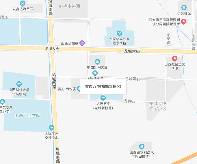 2020年9月,太原五中龙城新校区正式投入使用,新校区占地200亩,位于龙城南街以南、唐槐路以西。五中龙城校区为市政府重点建设的高标准、现代化的学校,校园建筑合理地将功能和景观融为一体,既传承了百年五中风格,又极富现代元素。教育教学及生活设施先进齐全,全省一流。