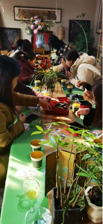 活动现场,古朴的长桌铺上了清新的绿布,一杯杯热茶氤氲着暖意,琳琅满目的珠子与丝线整齐摆放,等待着大家的创意巧思。在老师的耐心指导下,大家围坐在一起,挑选心仪的珠串,从配色搭配到穿线打结,一步步将晶莹剔透的水晶、温润的玉石、灵动的彩珠串联成独一无二的手链。