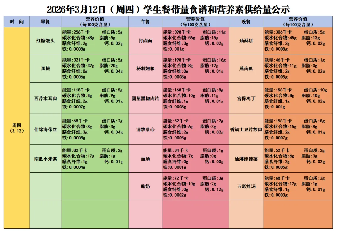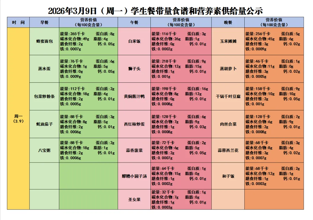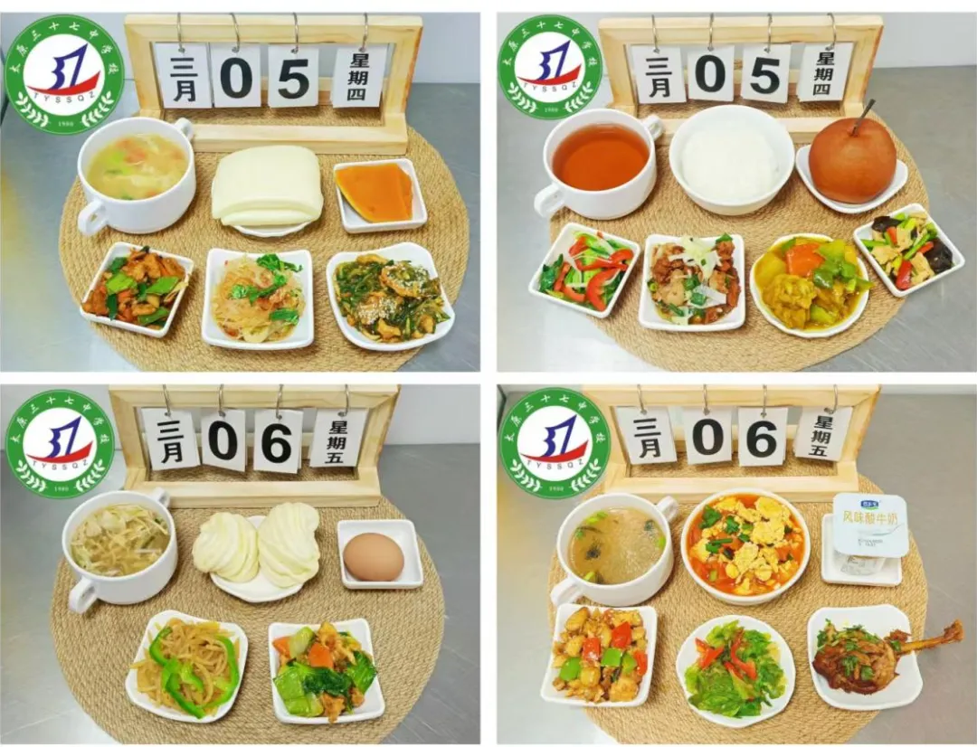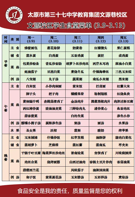 感谢您对太原市第三十七中学校的支持与关注。为了让您全面了解三十七中学子在学校的饮食情况,根据《太原市中小学校园食品安全和膳食经费管理监督办法》相关规定,学校每周餐带量食谱和营养素供给量确保学生膳食安全、营养、均衡、满足孩子健康成长需要,为我校学生做出安全健康可口的饭菜。给孩子一个健康、美味的童年,是您的期待,也是我们的责任!现将本周(3月9日—3月13日)的学生菜谱进行公示,欢迎各位师生及家长监督!